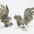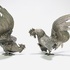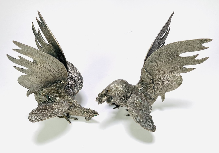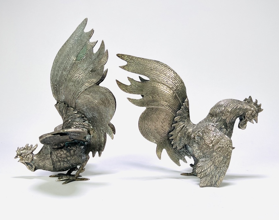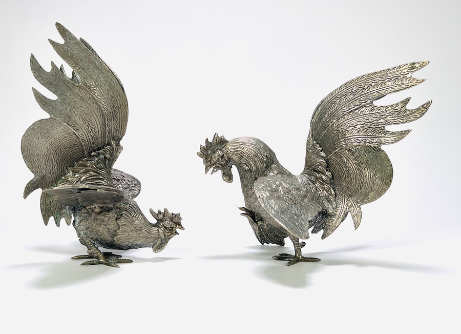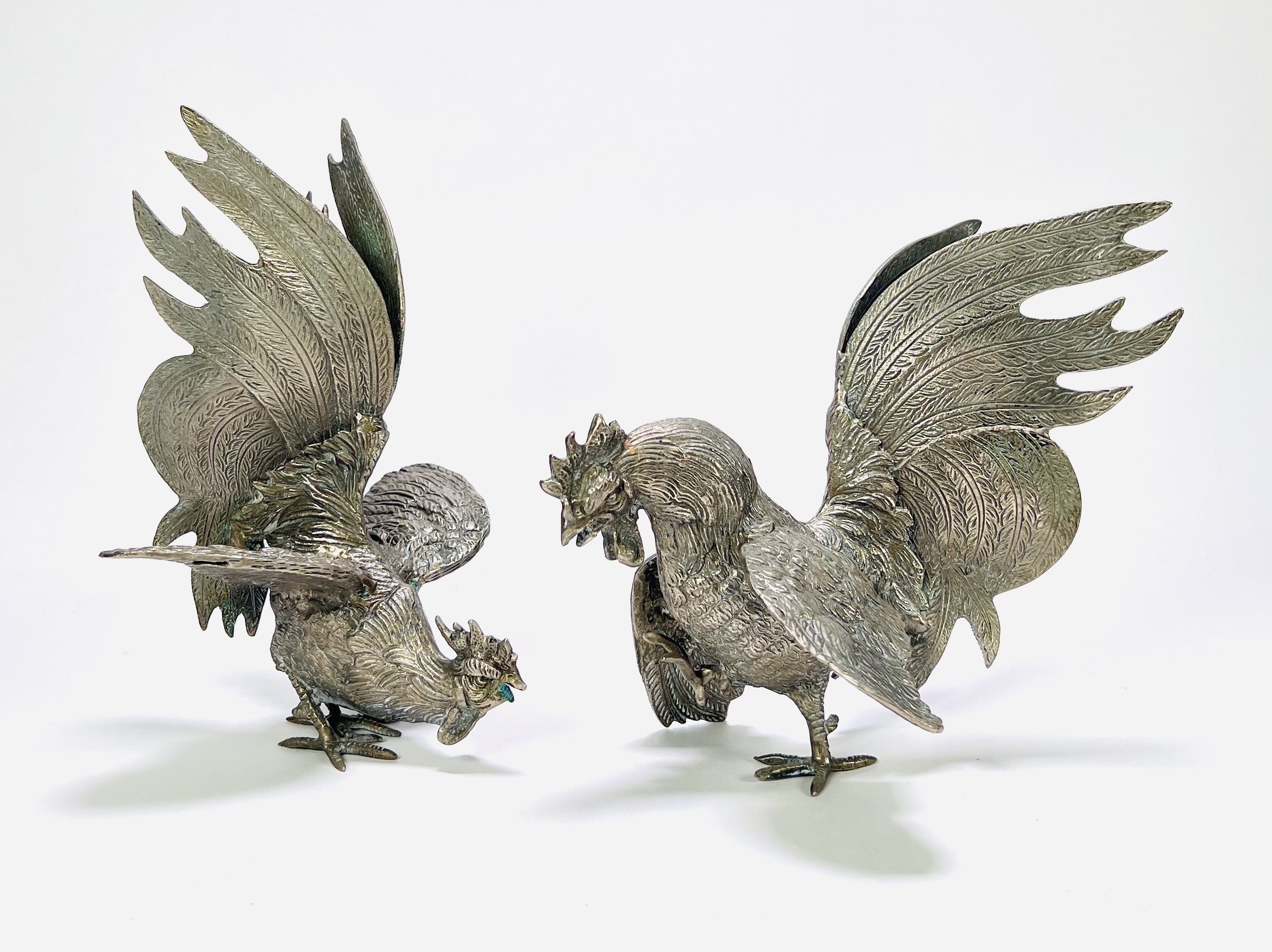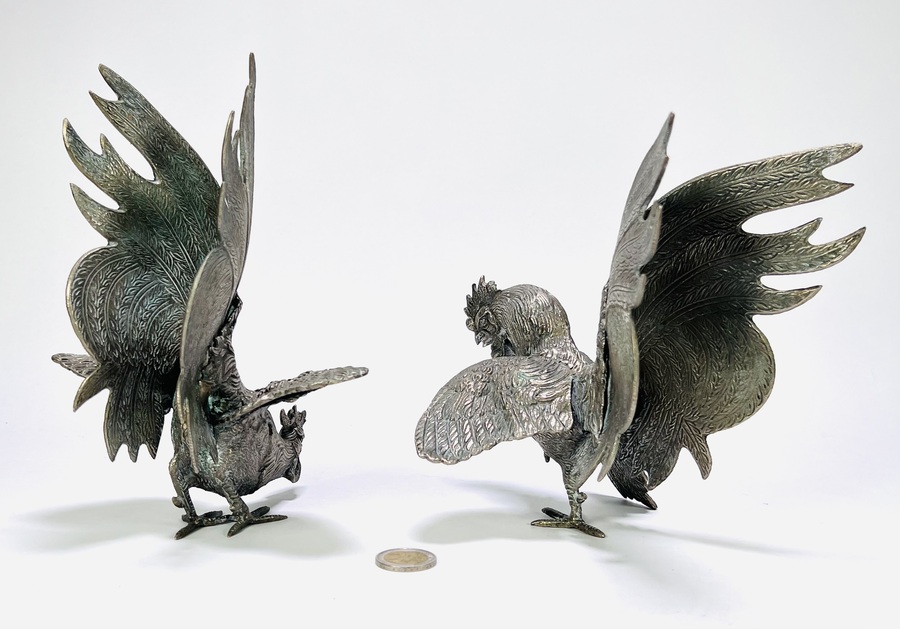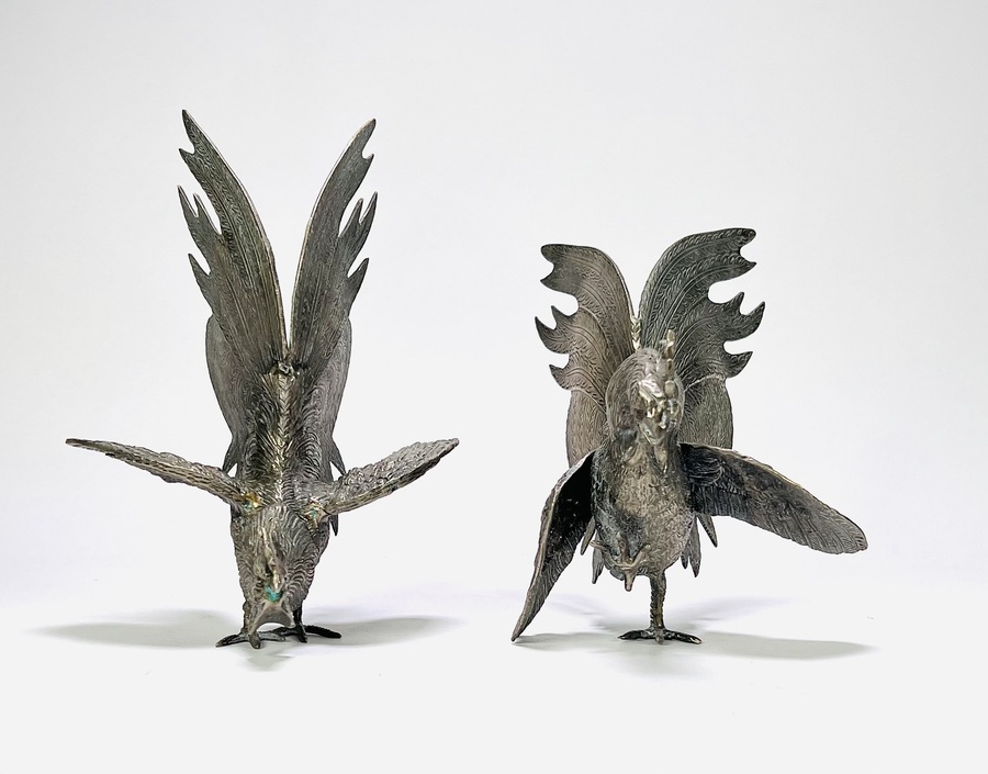Paar zilverkleurige metalen hanenbeelden in traditionele Japanse stijl, uitgevoerd met fijn gegraveerde details en expressieve balts- en gevechtshouding. Vervaardigd omstreeks begin 20e eeuw. Elk tafelstuk toont natuurlijke verenstructuren en dynamisch gevormde staarten. Wilt u meedoen aan de veiling? Registreer en bied live of online! |