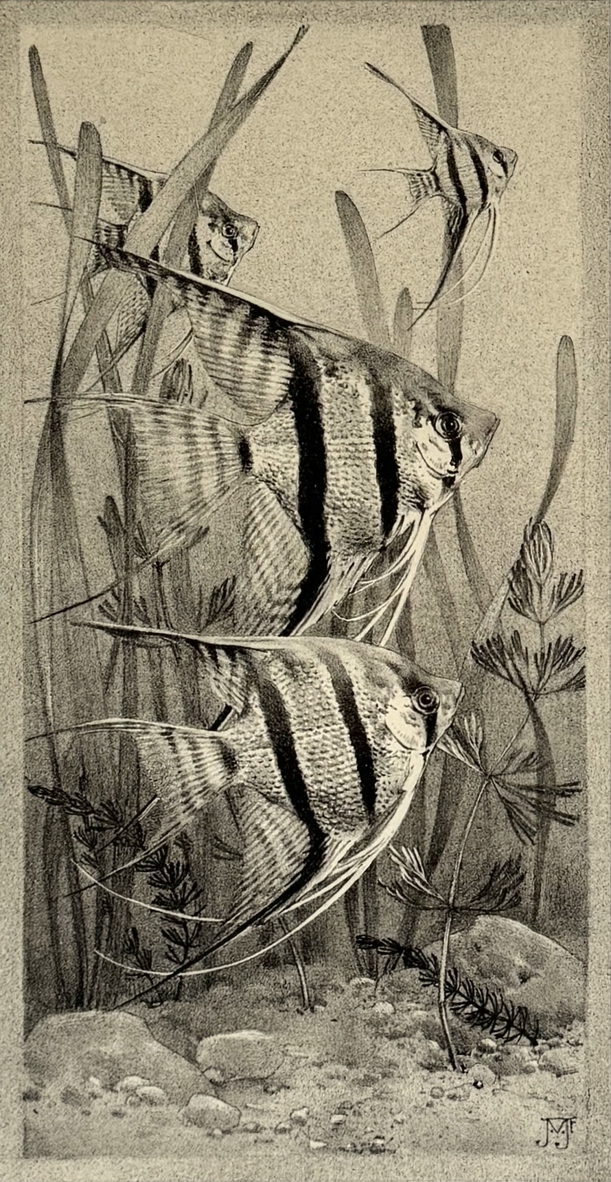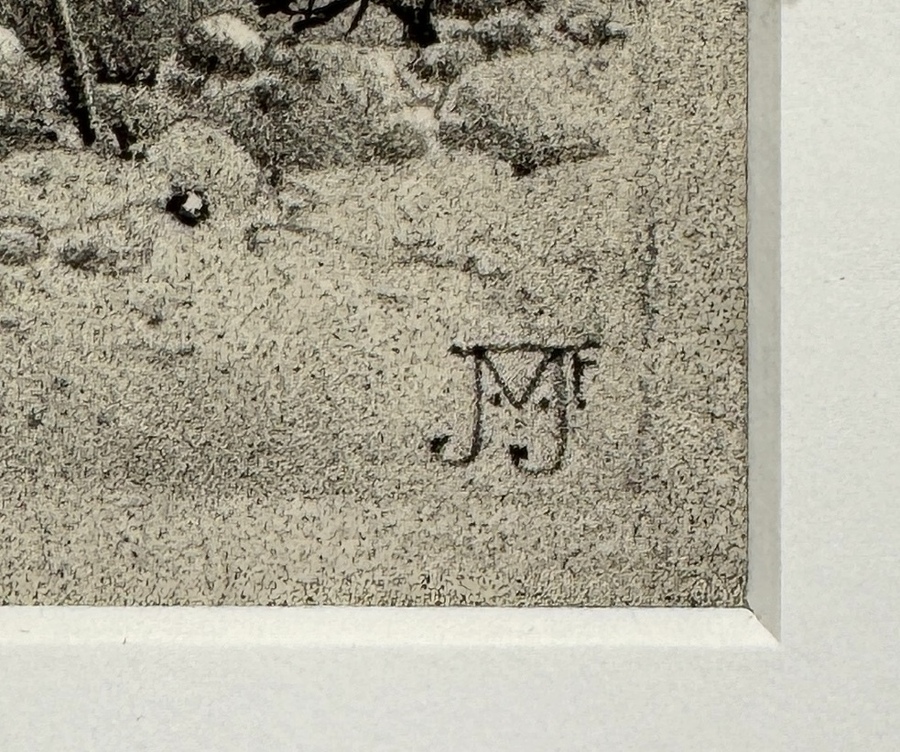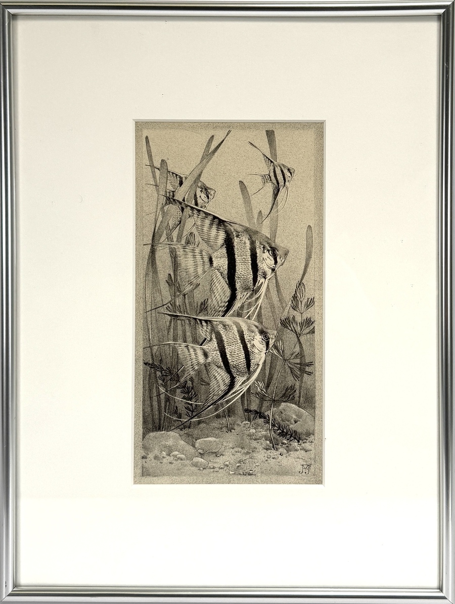 Litho op papier, midden 20e eeuw,. Naturalistische stijl met verfijnde weergave van vier maanvissen tussen waterplanten. Uitgevoerd in subtiele grijstinten met nadruk op structuur en textuur. Gesigneerd met monogram rechtsonder. Het werk is ingelijst en voorzien van een passe-partout. Zelf beoordelen? U bent welkom op onze kijkdagen op 29, 30 en 31 augustus! |