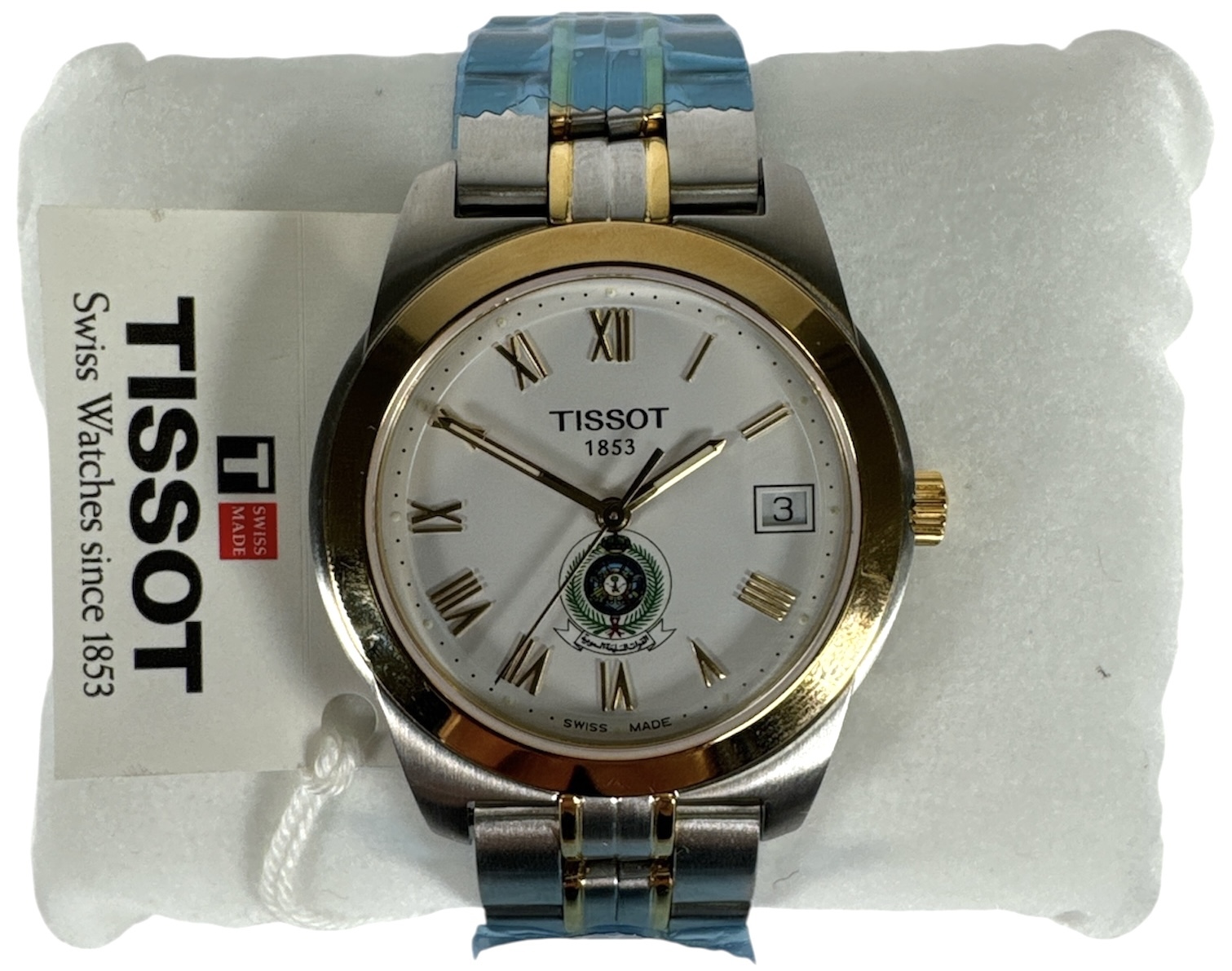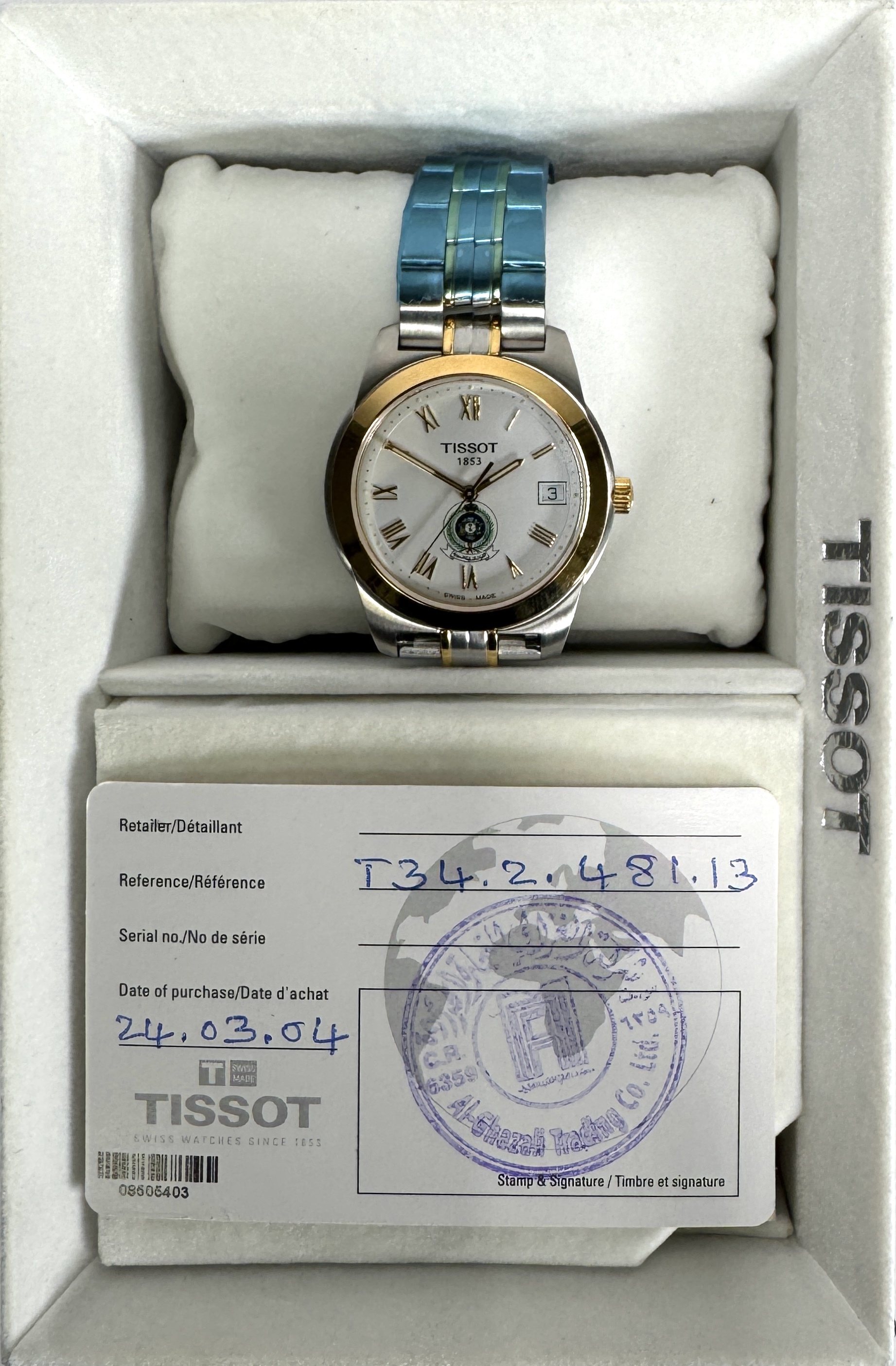 Tissot herenpolshorlog, ref. T34.2.481.13, datering 2004, roestvrij staal en verguld metaal met bicolor schakelband en witte wijzerplaat voorzien van Romeinse cijfers, datumvenster en centraal embleem. Inclusief originele doos en garantiekaart. Zwitsers horloge, techniek kwarts aangedreven, uitgevoerd ter gelegenheid van 150 jaar Tissot, met klassieke en eigentijdse accenten. Bied eenvoudig mee, live of online. Registreer nu. |