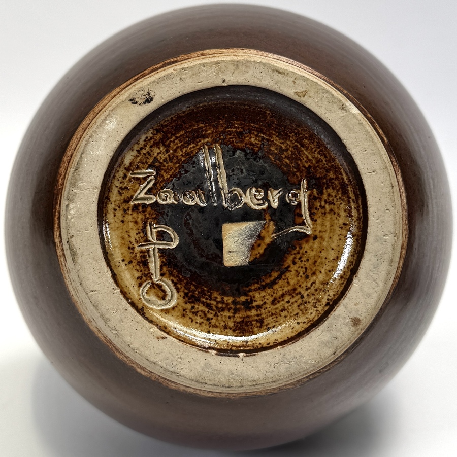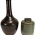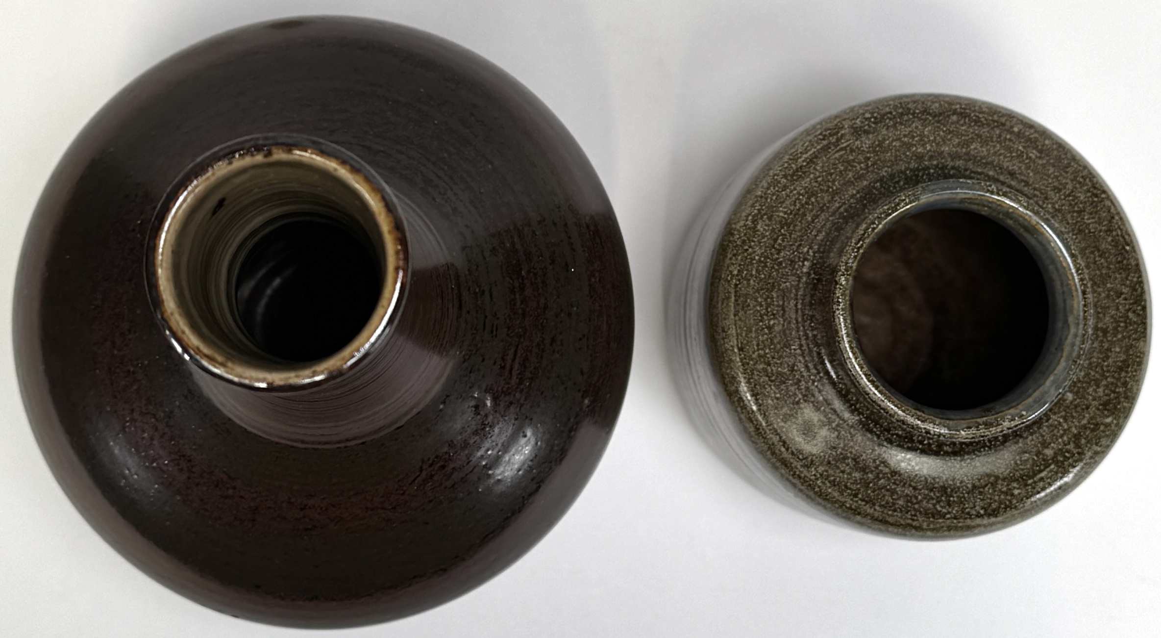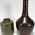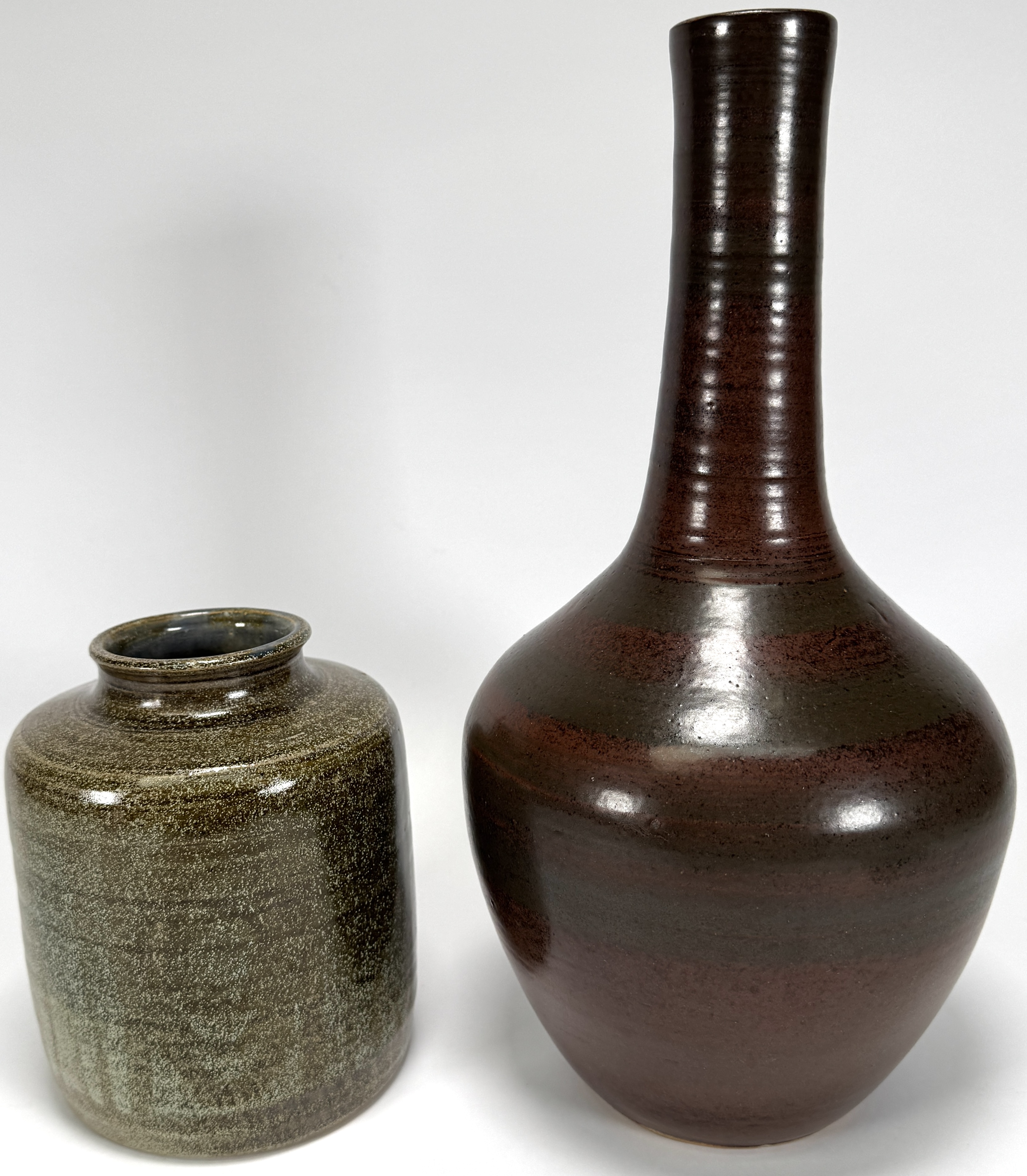 Twee aardewerken vazen in naoorlogse modernistische stijl: een vaas met langgerekte hals, onderzijde gesigneerd Zaalberg, ca. 1960; de tweede cilindrische vaas, onderzijde gesigneerd Dick 65. Vazen met ijzerbruine en grijsgroene glazuren. Kom langs tijdens de kijkdagen (29 t/m 31 augustus) en ontdek deze aardewerken vazen zelf! |
