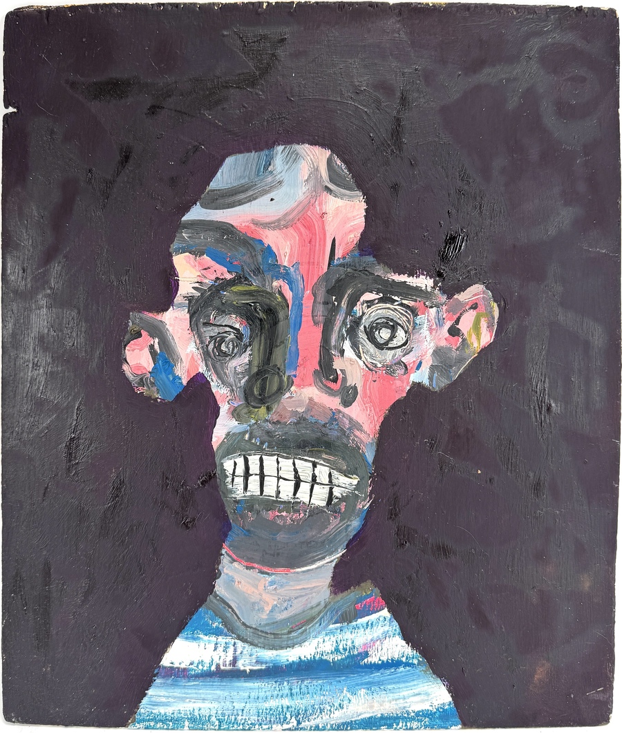 Tweezijdig beschilderd schilderij uitgevoerd in olieverf op paneel, in expressieve stijl. De ene zijde toont een grotesk portret met ruwe penseelvoering, de andere zijde een scène met twee figuren in een expressief landschap. Rechtsonder op de figuratieve zijde onduidelijk gesigneerd. Het werk toont kenmerken van neo-expressionisme en dateert uit omstreeks eind 20e of begin 21e eeuw. Wil je het schilderij in het echt bekijken? Kom naar de kijkdagen op 29, 30 en 31 augustus! |