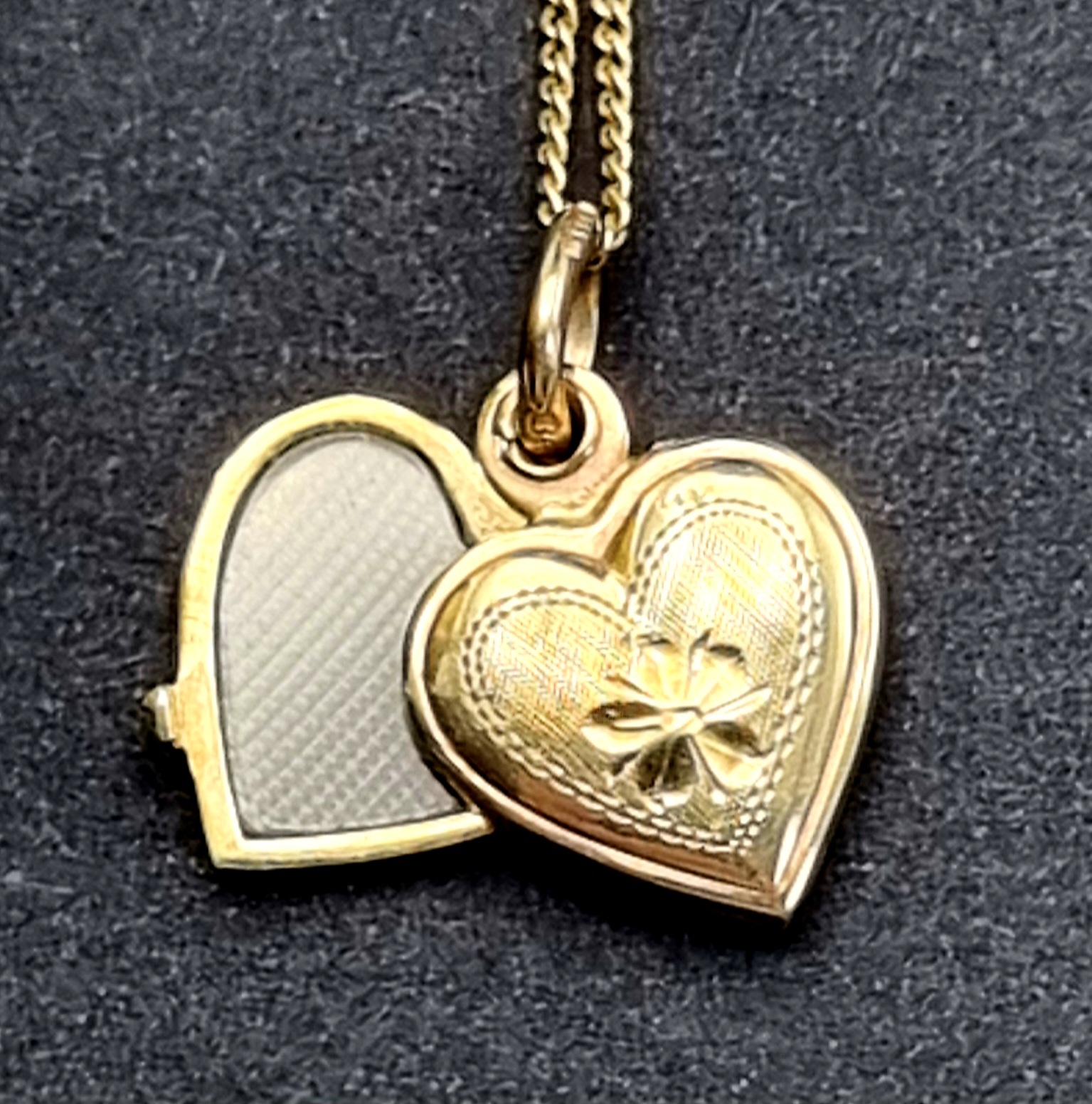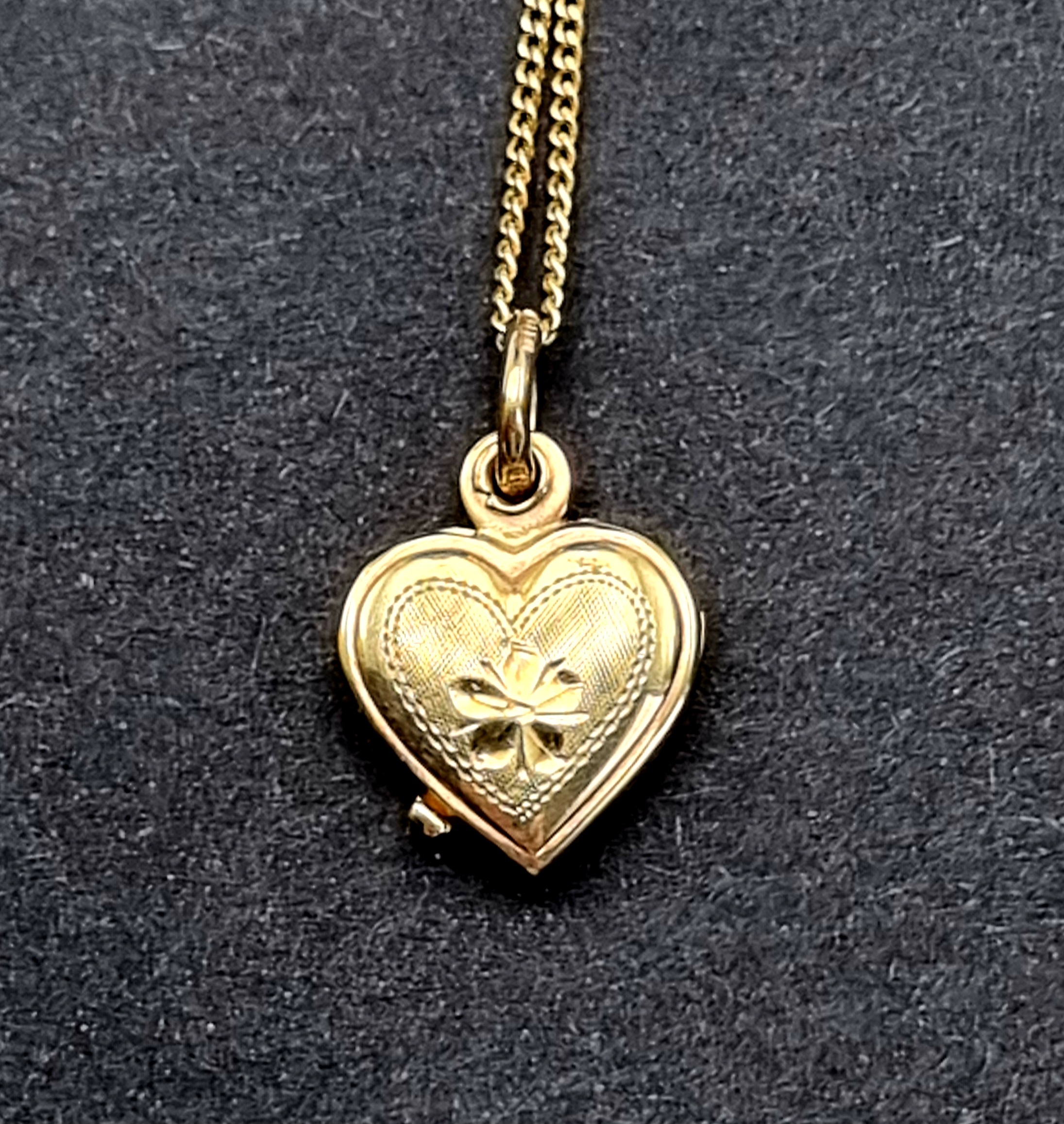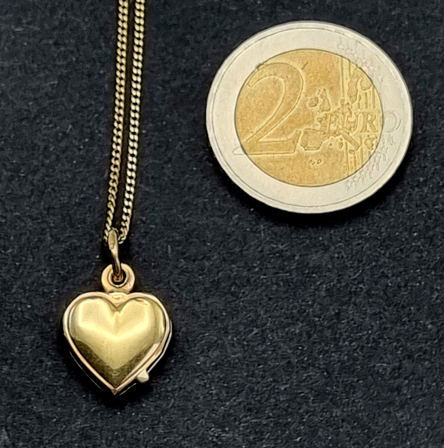Een gouden ketting met een hartvormige hanger, gedateerd midden 20e eeuw. De ketting is gemerkt met 750 (18 karaat goud), terwijl de hanger is gemerkt met 333 (8-karaats goud). De hanger kan geopend worden en is aan de buitenzijde gedecoreerd met gegraveerde patronen en een strik. Zeker zijn van deelname? Plaats vanaf 22 augustus een schriftelijk bod online! |