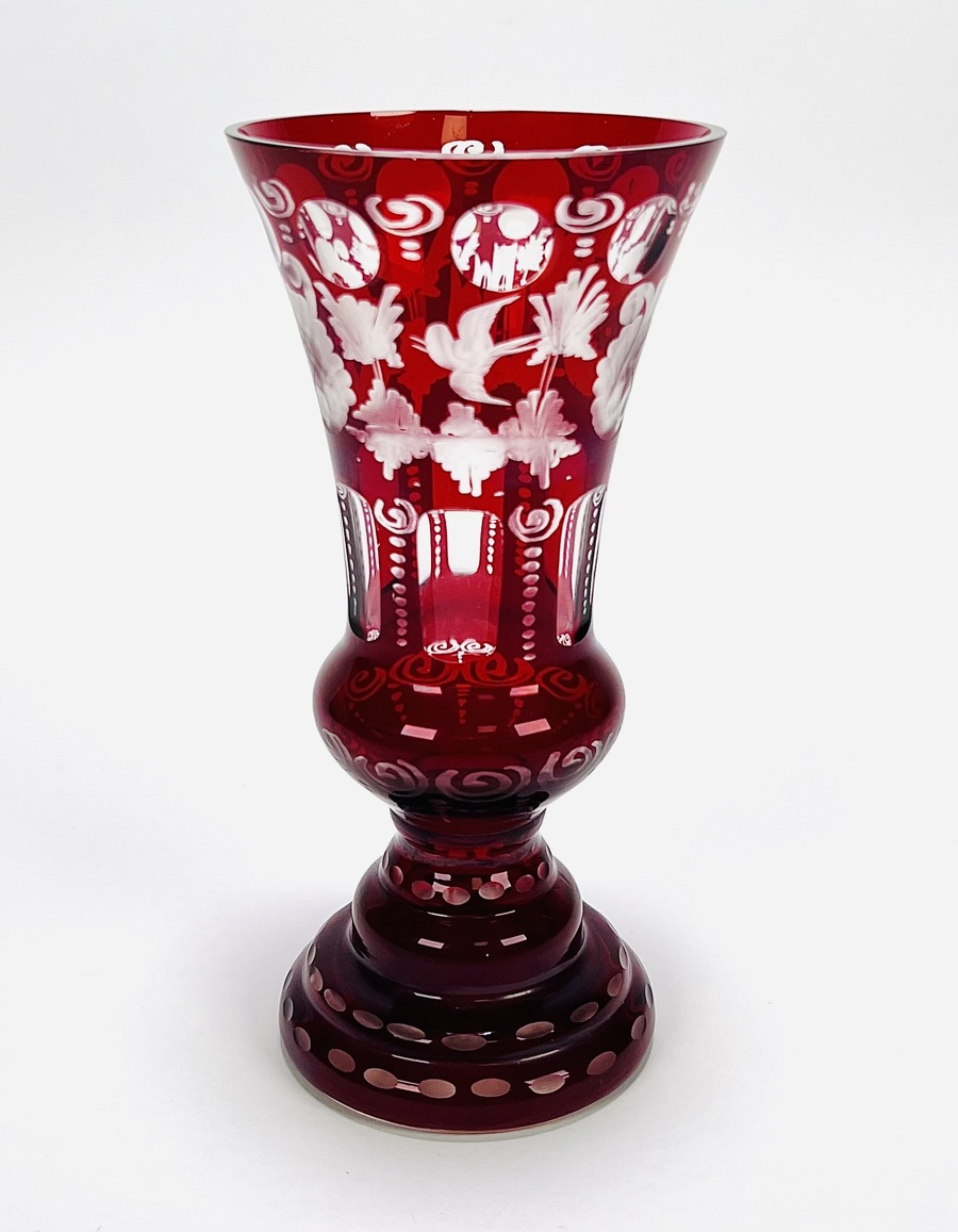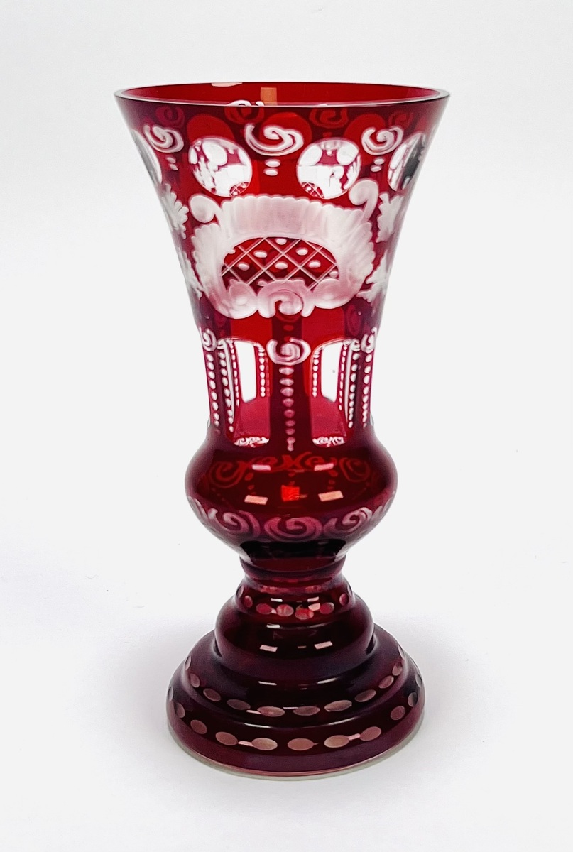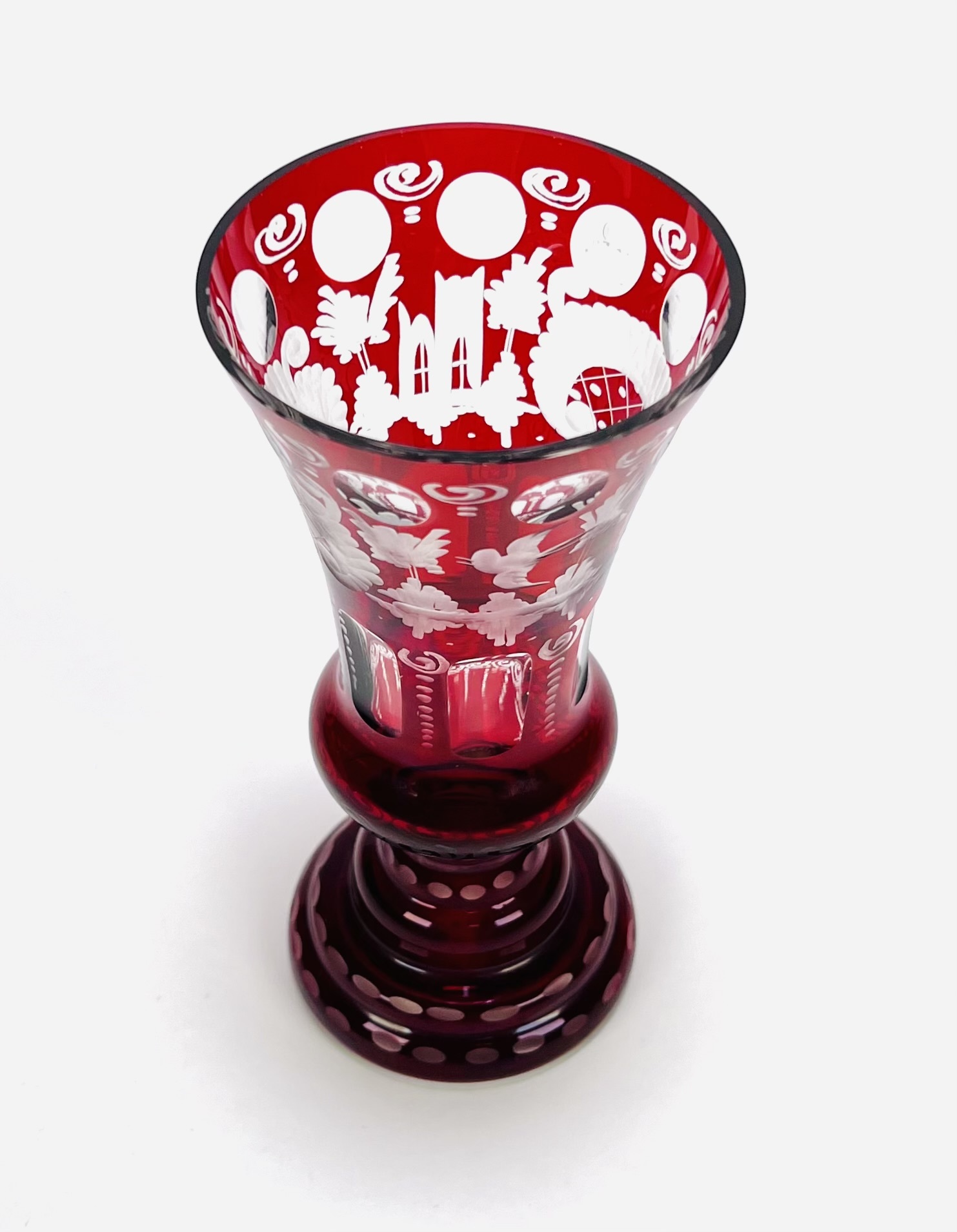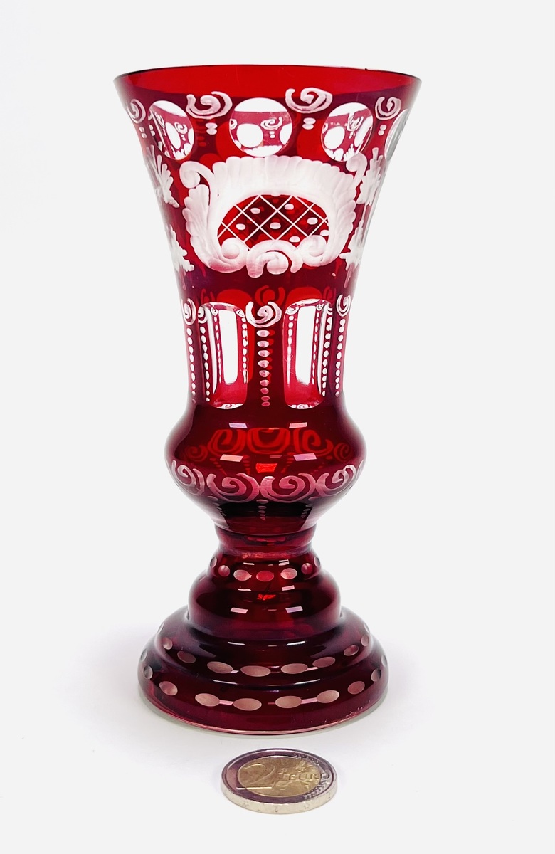 Gelaagde glazen vaas in rood transparant Boheems overlay glas, omstreeks 1900. De vaas is kelkvormig, uitgevoerd met diep geslepen motieven in druivenranken, gotische ramen en landschappen. De decoratie toont florale en architecturale elementen in uitgespaarde witte zones. Uitgevoerd in helder en robijnrood glas met ronde voet en geslepen details. Zeker zijn van deelname? Plaats vanaf 22 augustus een schriftelijk bod online! |