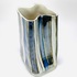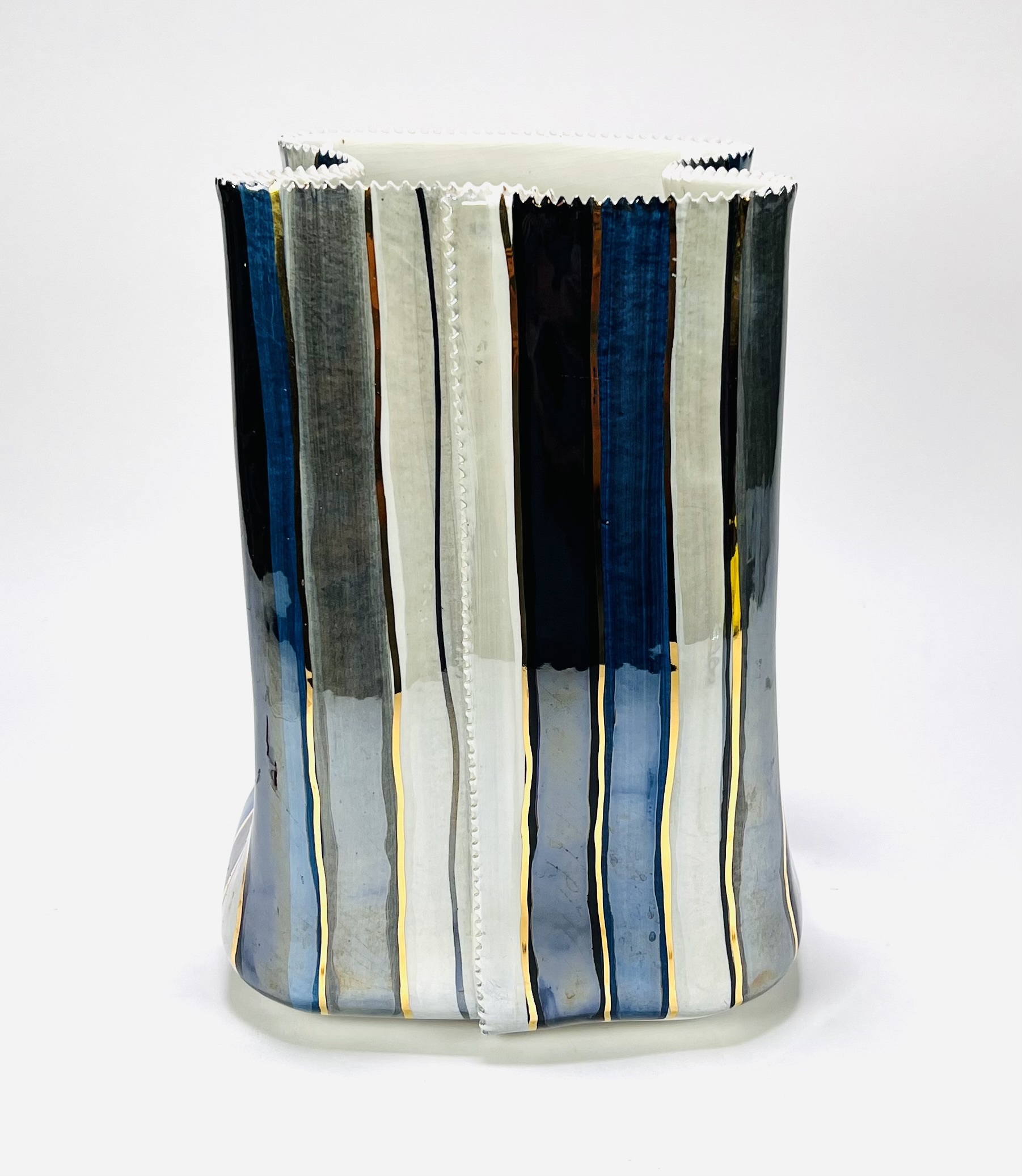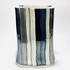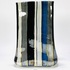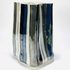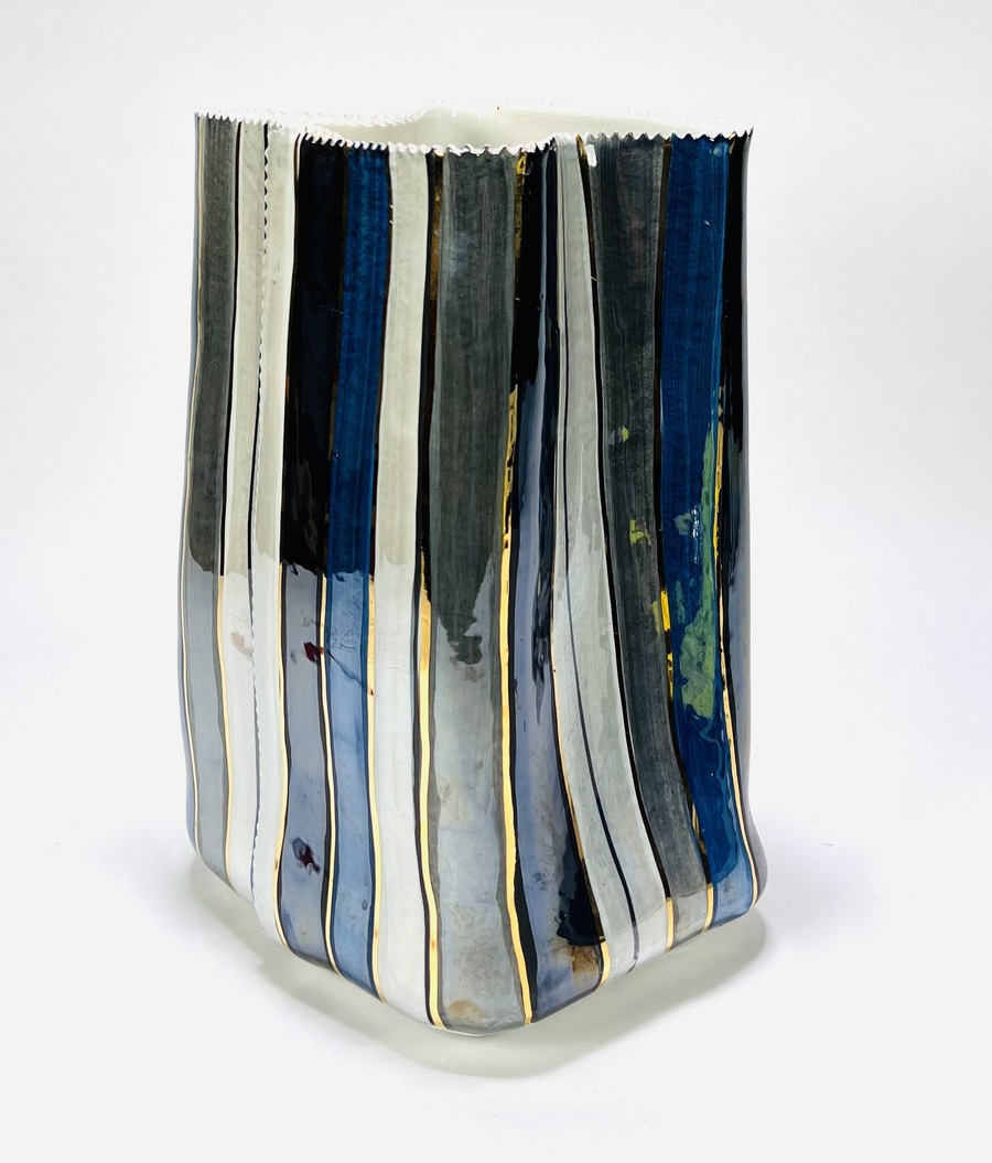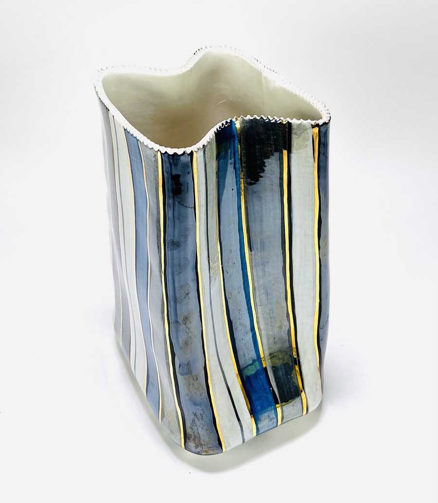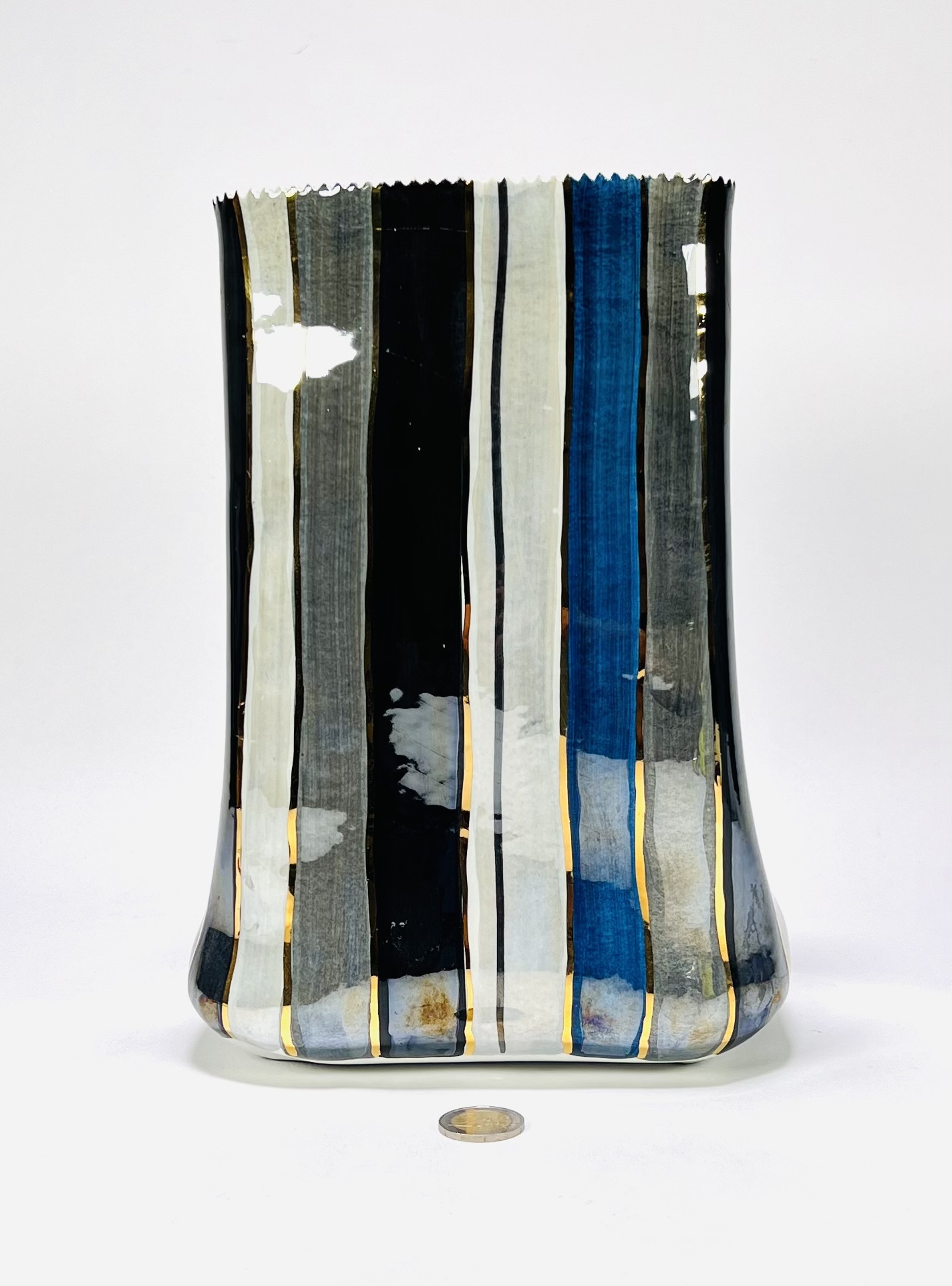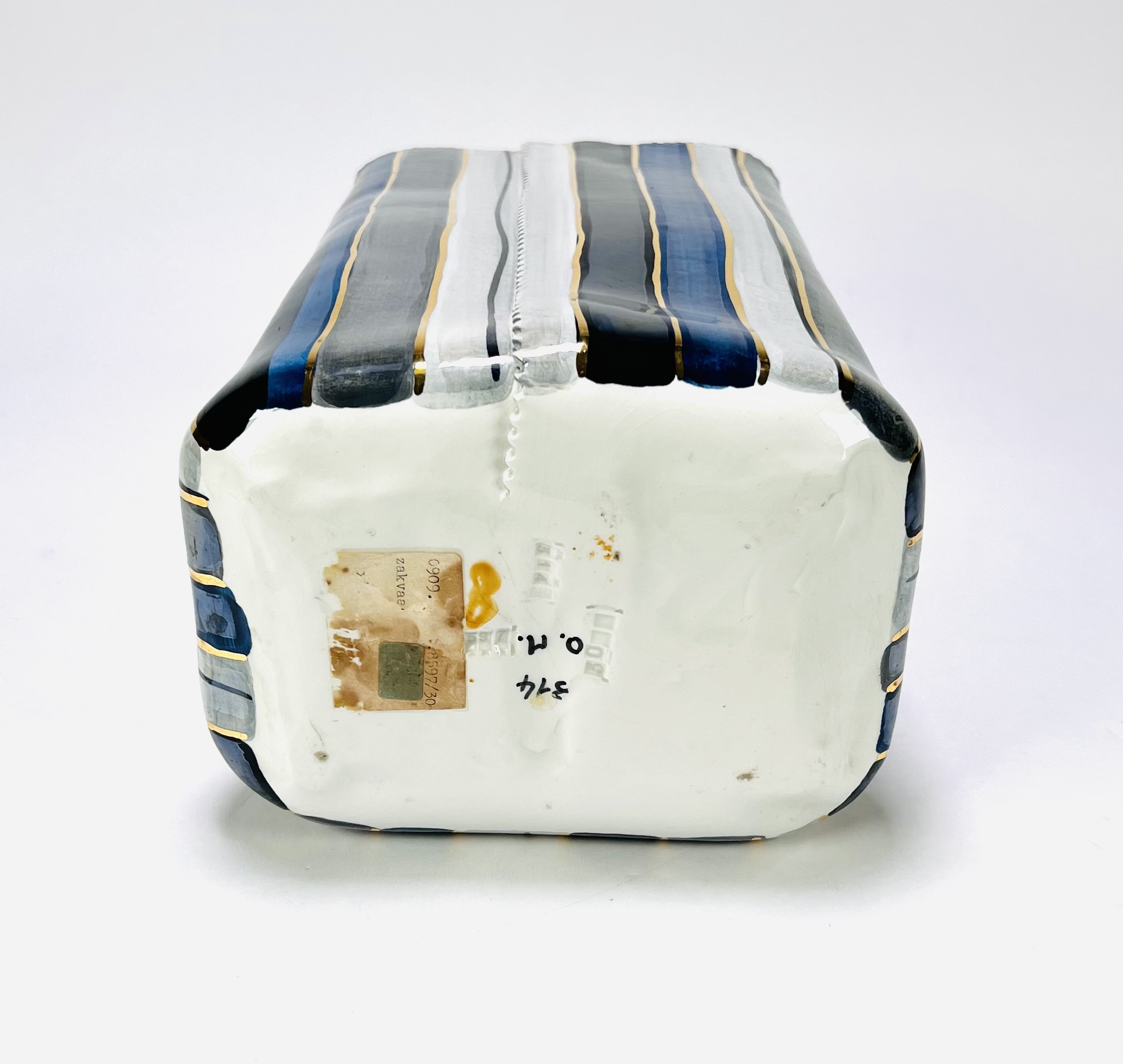 Keramische designvaas, omstreeks 1990, uitgevoerd in handgevormd geglazuurd aardewerk met golvende vierkante vorm en kartelrand. Decor met verticale banen in blauw, wit en zwart, afgewisseld met goudkleurige lijnen. De onderzijde met resten van originele sticker "zakvaas" en handgeschreven serienummer.. Wilt u bieden? Schrijf u in en doe mee aan de veiling! |