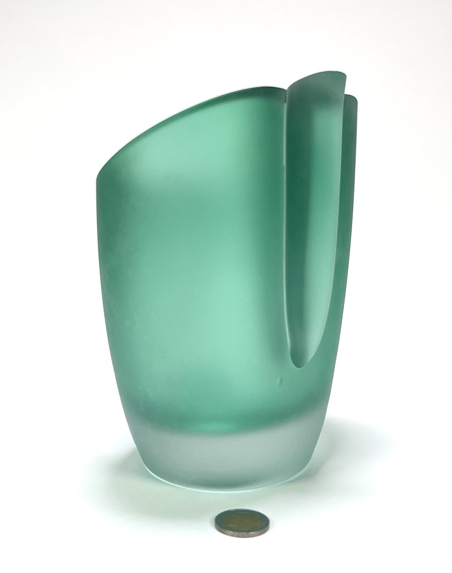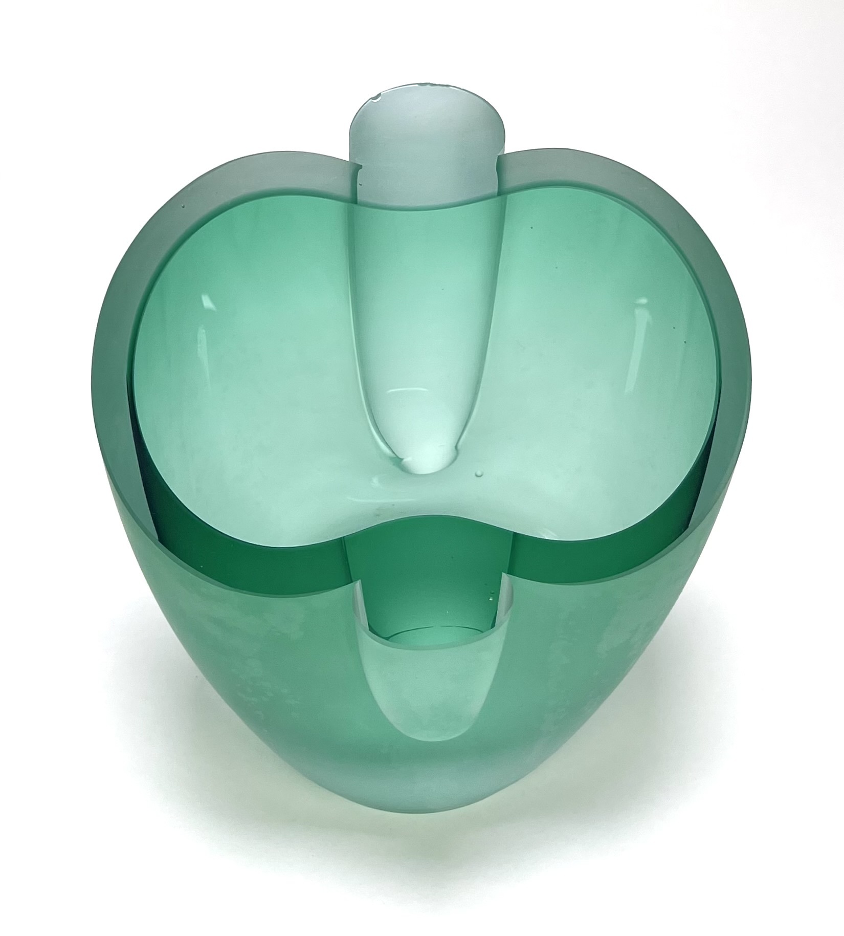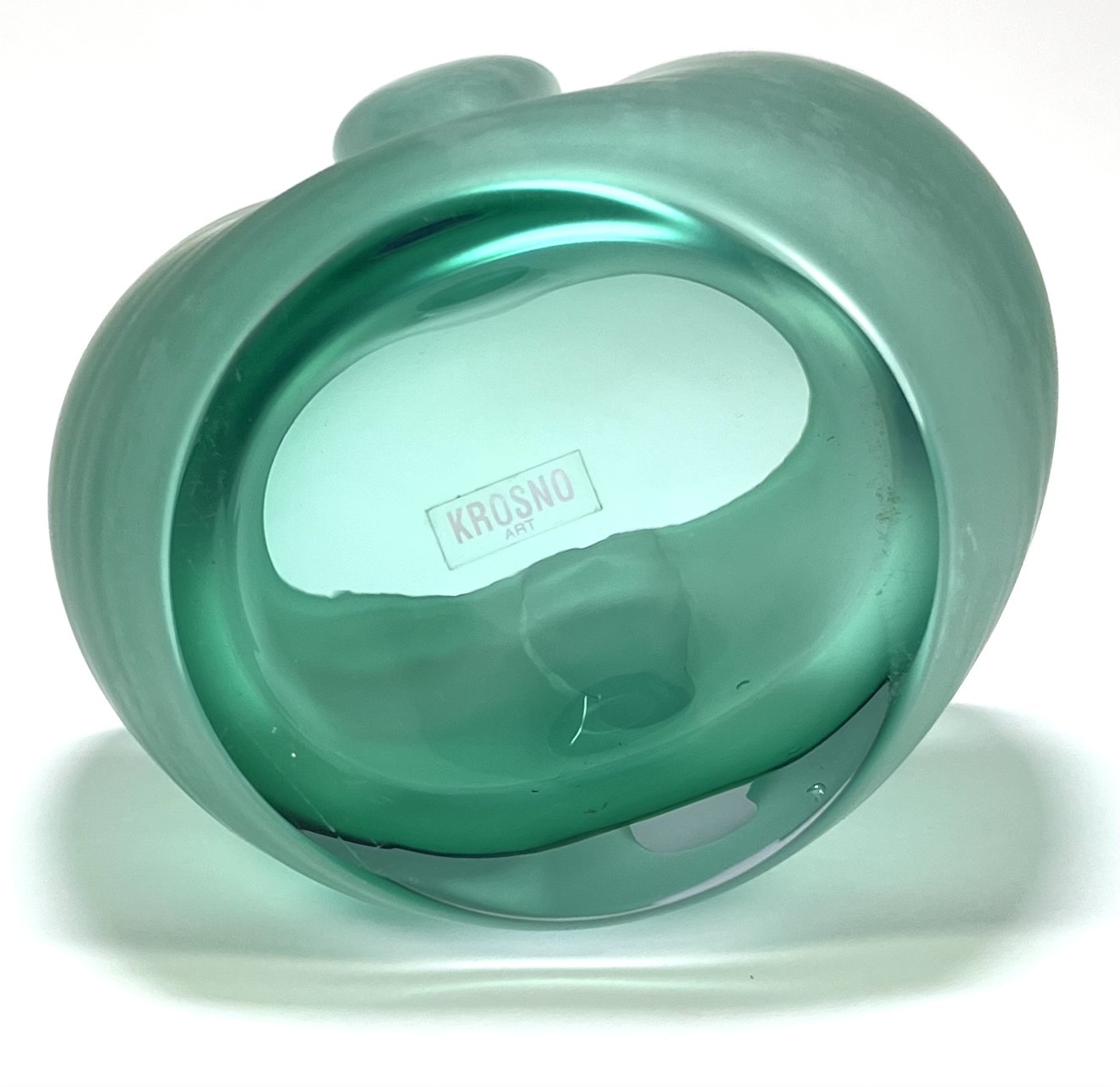 Moderne sculpturale vaas van Krosno Art (Polen), eind 20e eeuw. Uitgevoerd in zwaar, transparant groen kristalglas met deels matte en deels gepolijste oppervlakken. De asymmetrische bovenrand met vier holtes en de organische, sculpturale vorm geven het object een kenmerkende modernistische uitstraling. Onderzijde gemerkt met transparante stempel KROSNO ART. Geïnteresseerd? Bezoek onze kijkdagen op 29, 30 of 31 augustus van 11:00 tot 17:00 uur! |