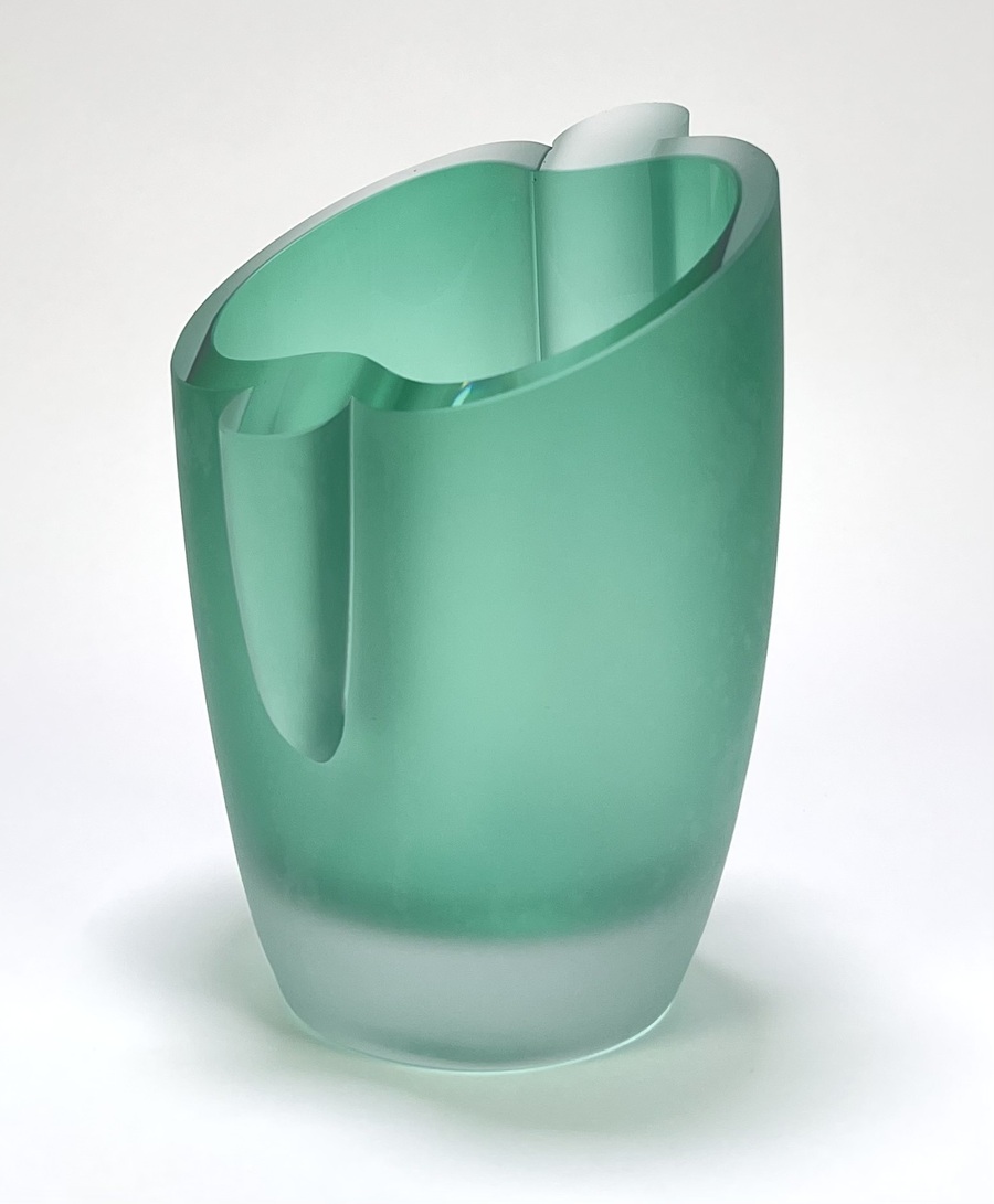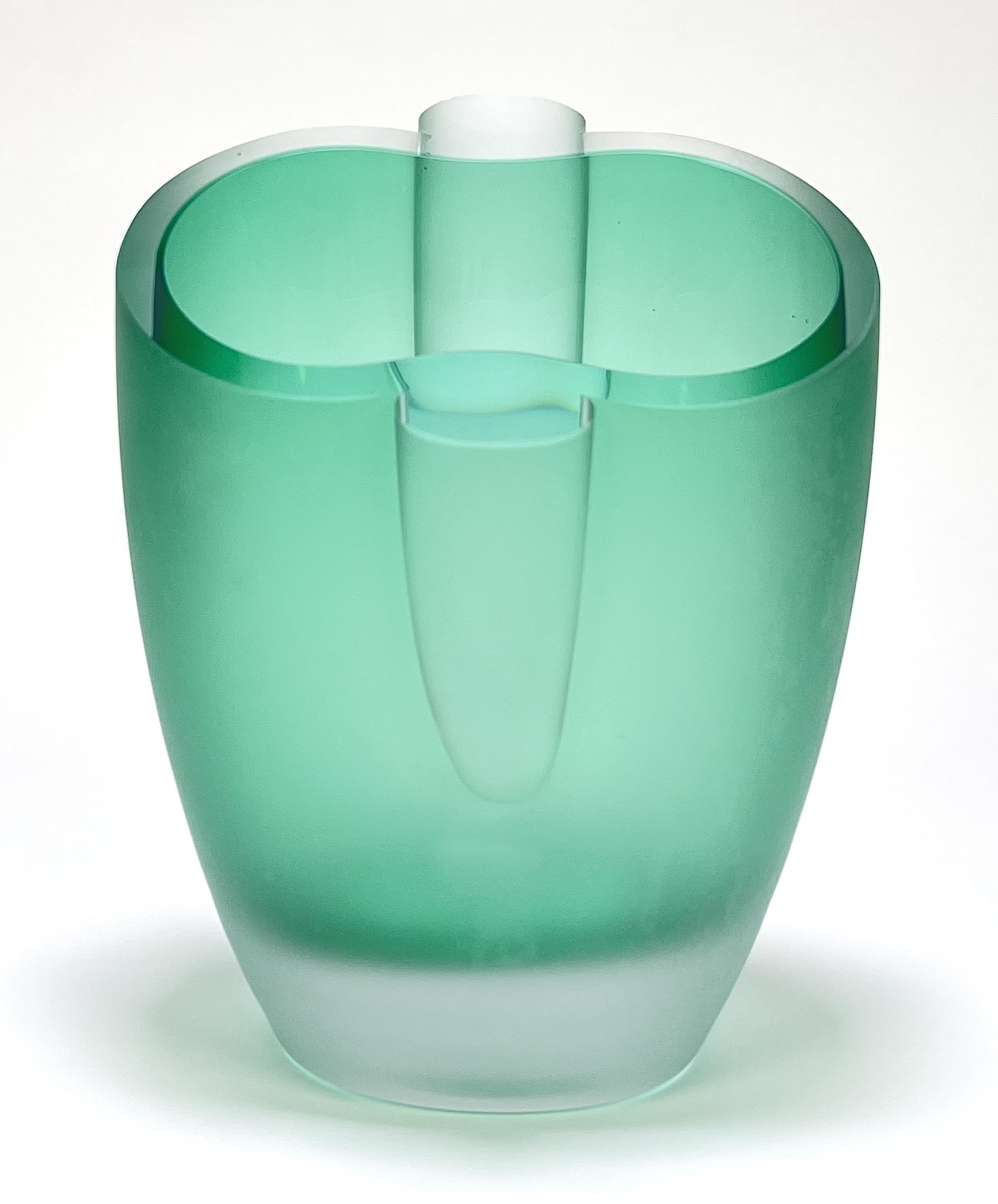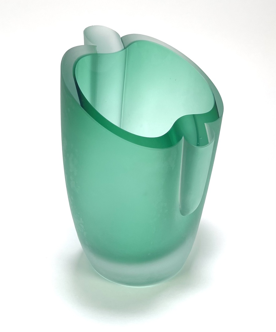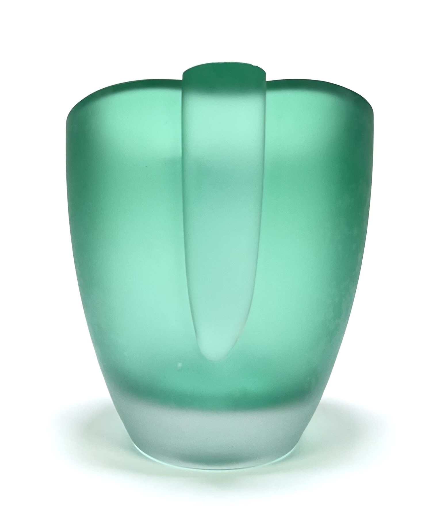 Moderne sculpturale vaas van Krosno Art (Polen), eind 20e eeuw. Uitgevoerd in zwaar, transparant groen kristalglas met deels matte en deels gepolijste oppervlakken. De asymmetrische bovenrand met vier holtes en de organische, sculpturale vorm geven het object een kenmerkende modernistische uitstraling. Onderzijde gemerkt met transparante stempel KROSNO ART. Geïnteresseerd? Bezoek onze kijkdagen op 29, 30 of 31 augustus van 11:00 tot 17:00 uur! |