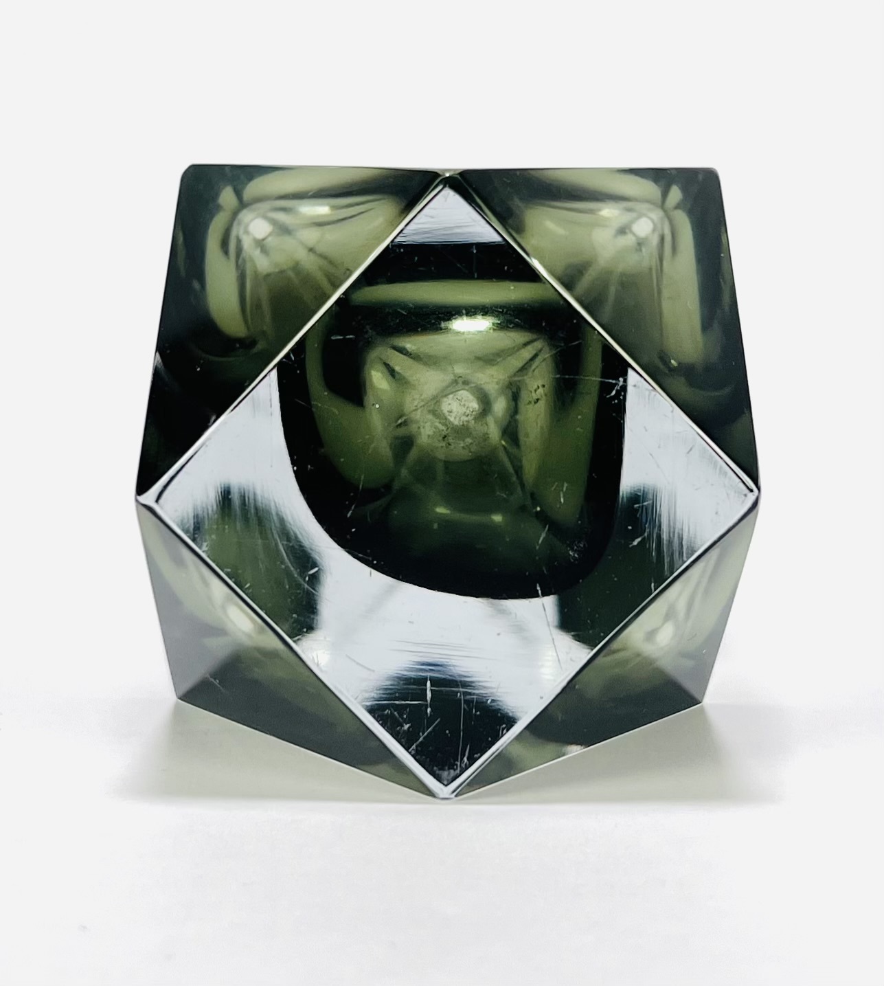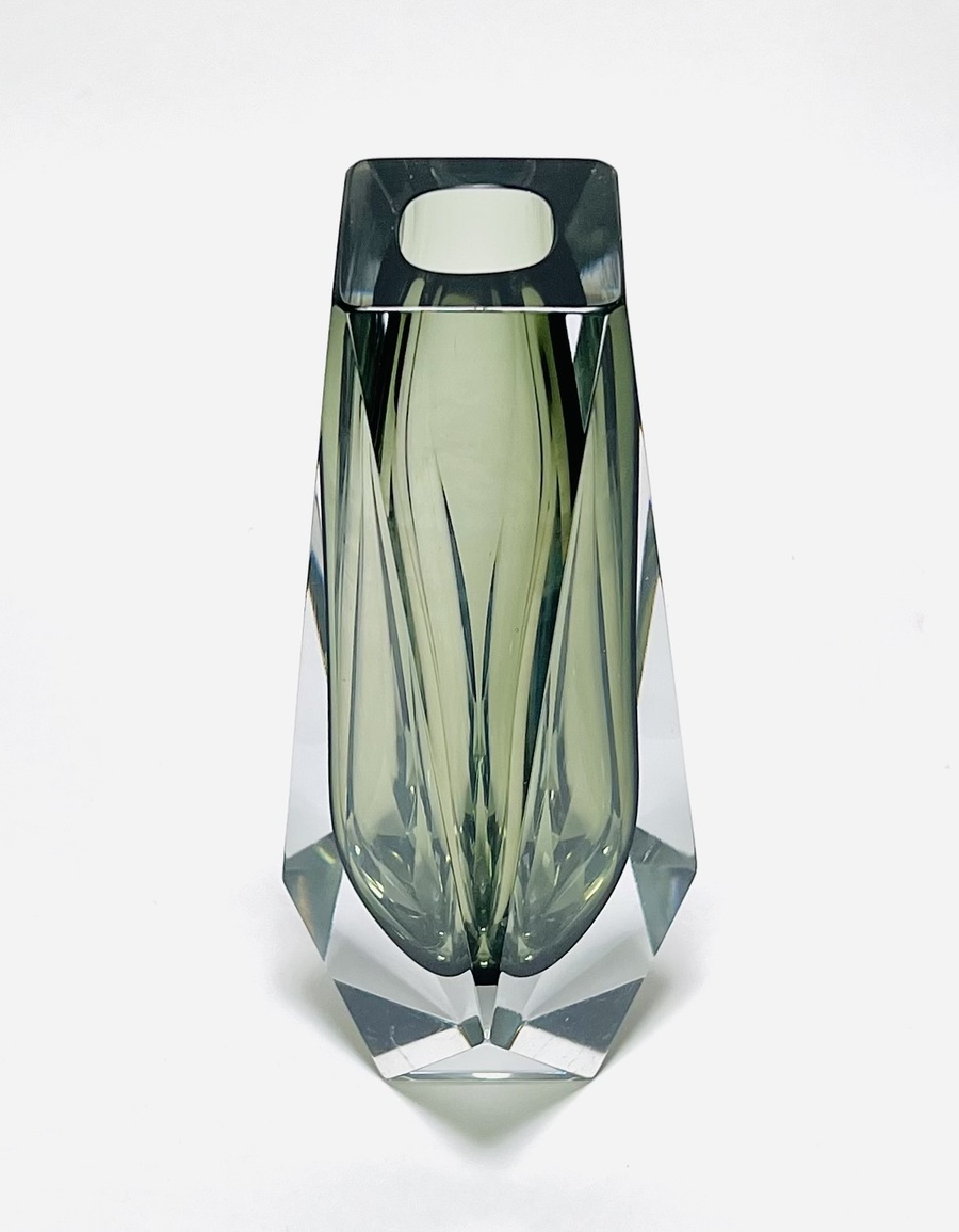 Glazen vaas uit omstreeks midden 20e eeuw, uitgevoerd in Sommerso-techniek. Deze vaas combineert transparant en groen glas in gelaagde opbouw en is voorzien van een vierkante opening, gefacetteerde vlakken en strakke geometrische lijnen. Het object is ontworpen als sculpturaal decoratief element en past binnen modernistische interieurstijlen. Wil je de vaas in het echt bekijken? Kom naar de kijkdagen op 29, 30 en 31 augustus! |