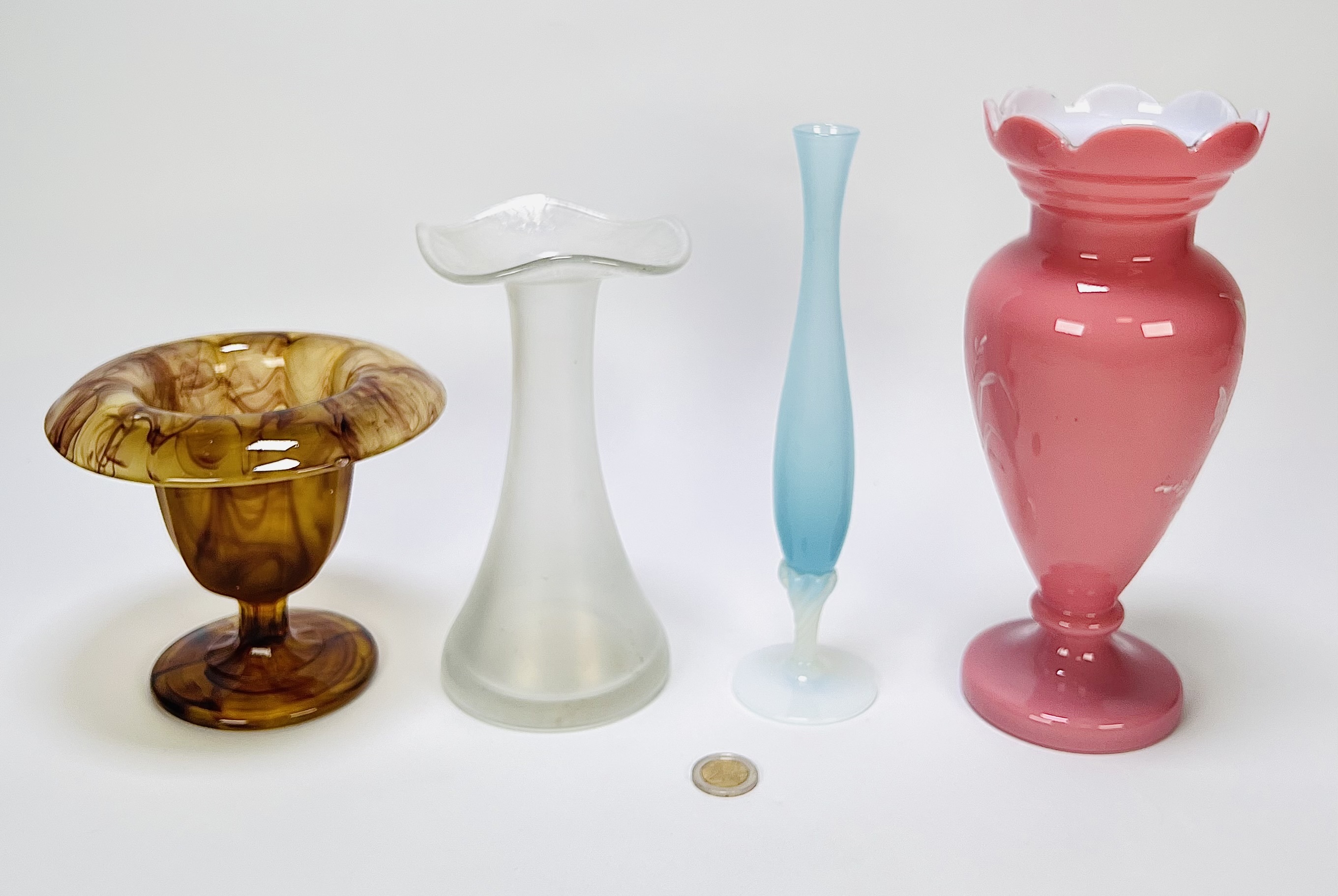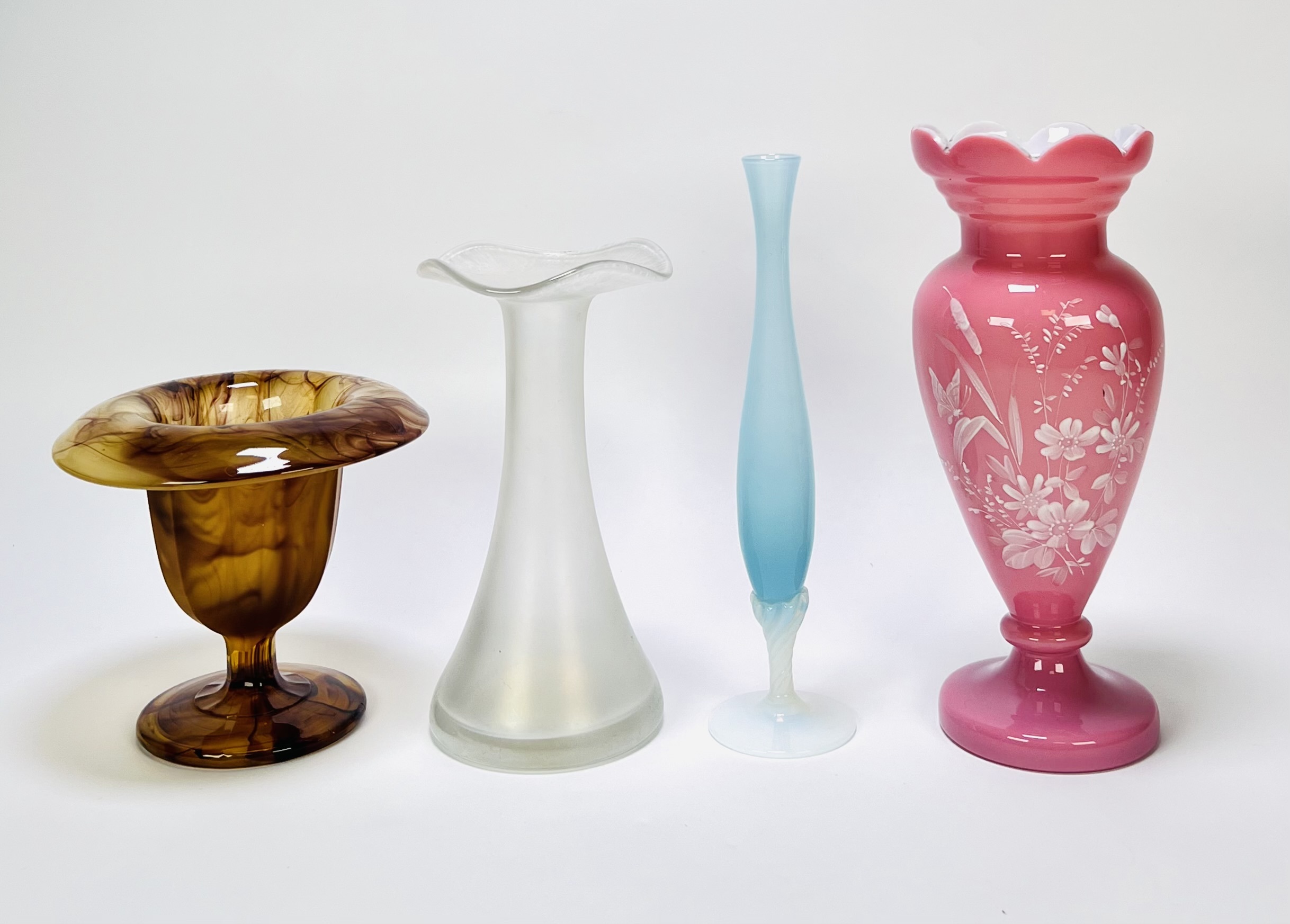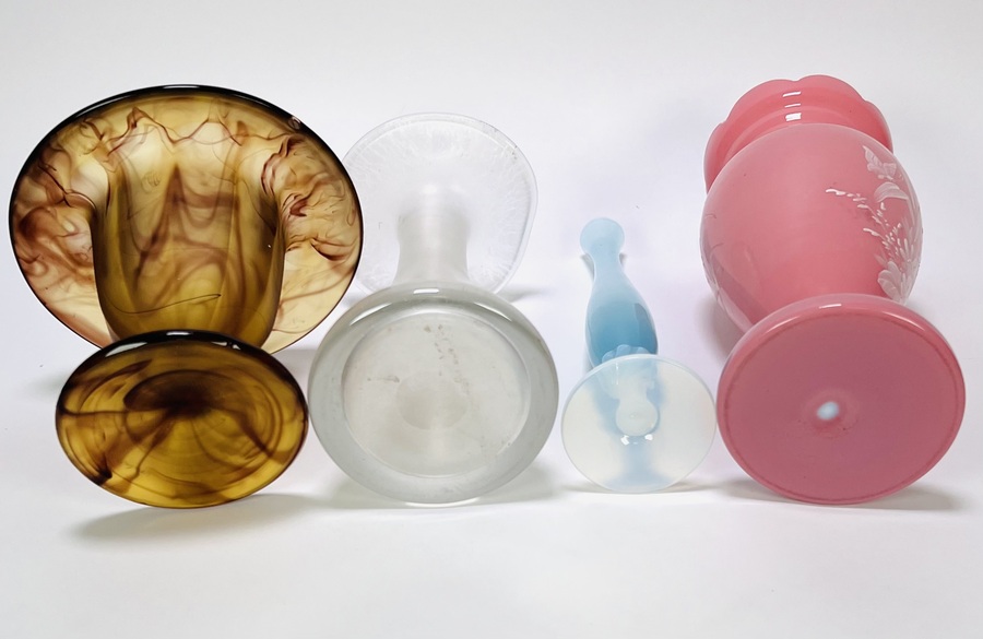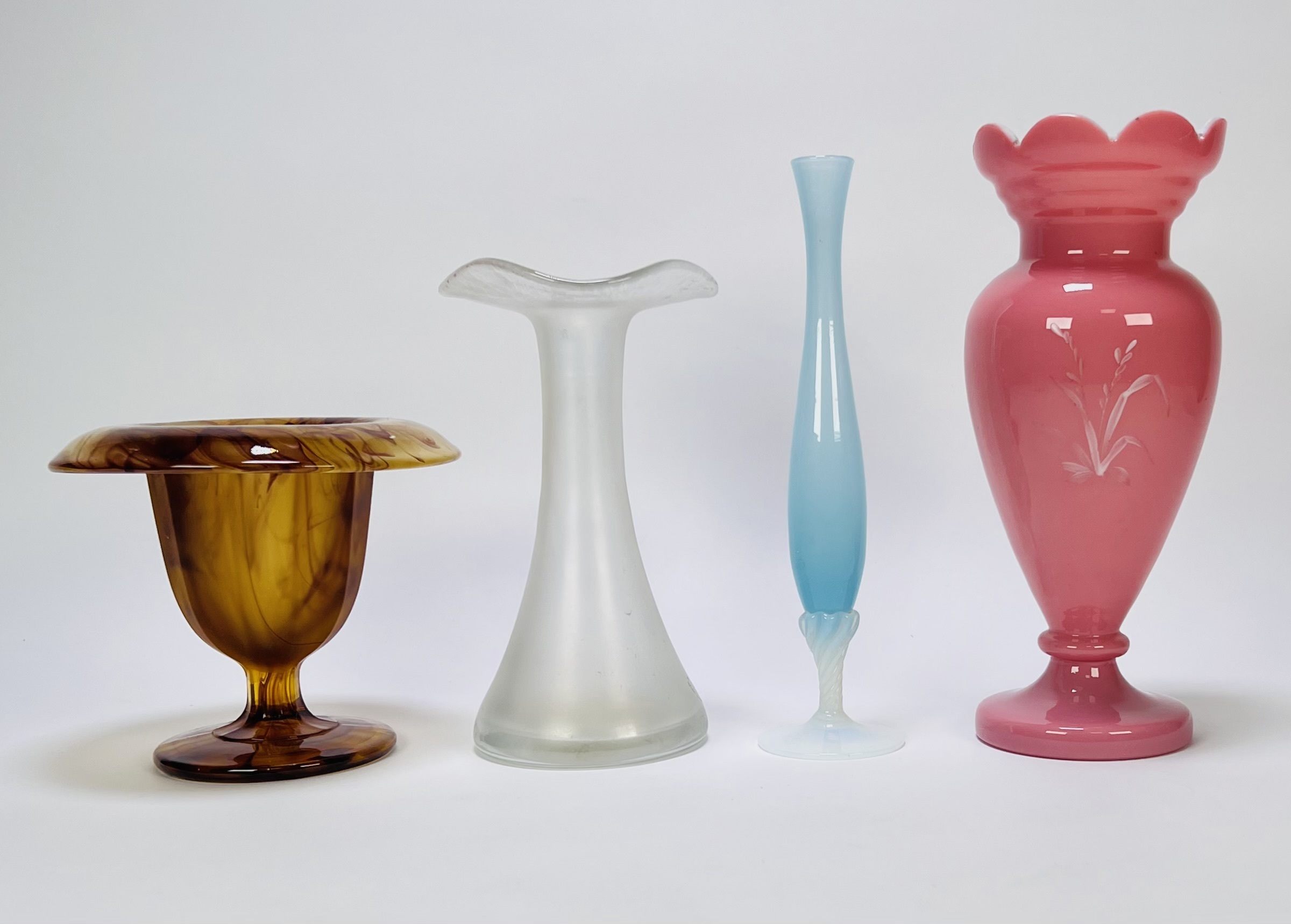 Vier ongesigneerde vazen in glas, 20e eeuw, uitgevoerd in verschillende technieken zoals glasblazen, kleurmenging en graveren. Bestaat uit transparante, opaline, gemarmerde en roze exemplaren, waarvan één met wit gegraveerd bloemmotief. Variërend in vorm van slank cilindrisch tot breed uitlopend. Wil je de vazen in het echt bekijken? Kom naar de kijkdagen op 29, 30 en 31 augustus! |