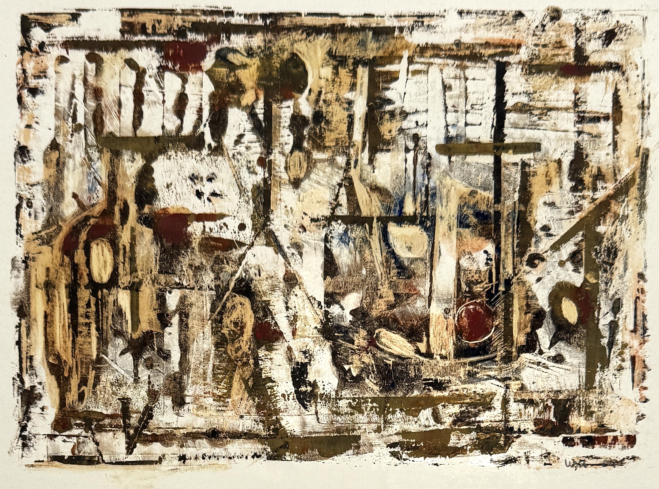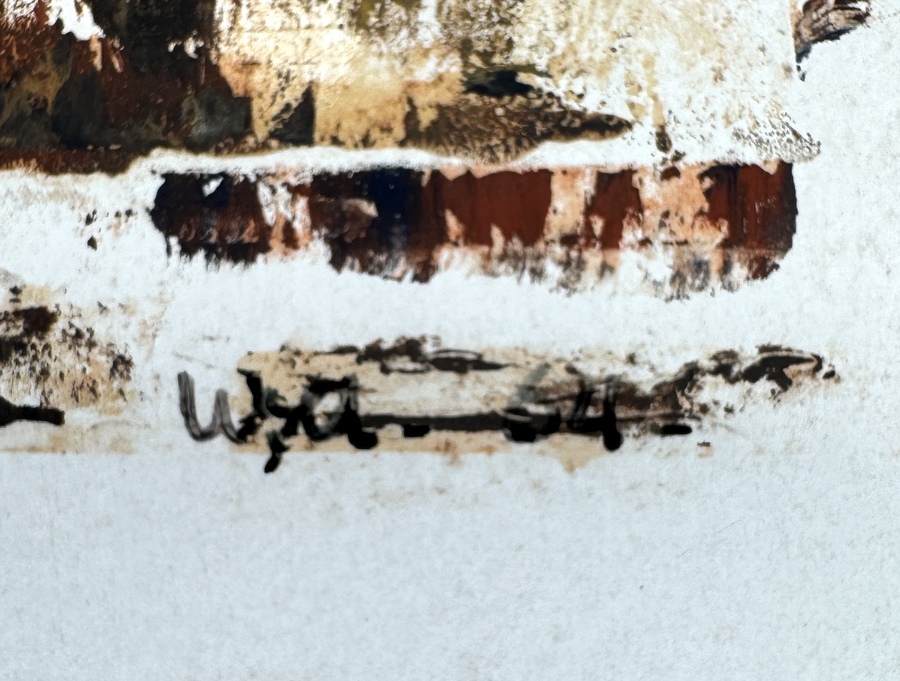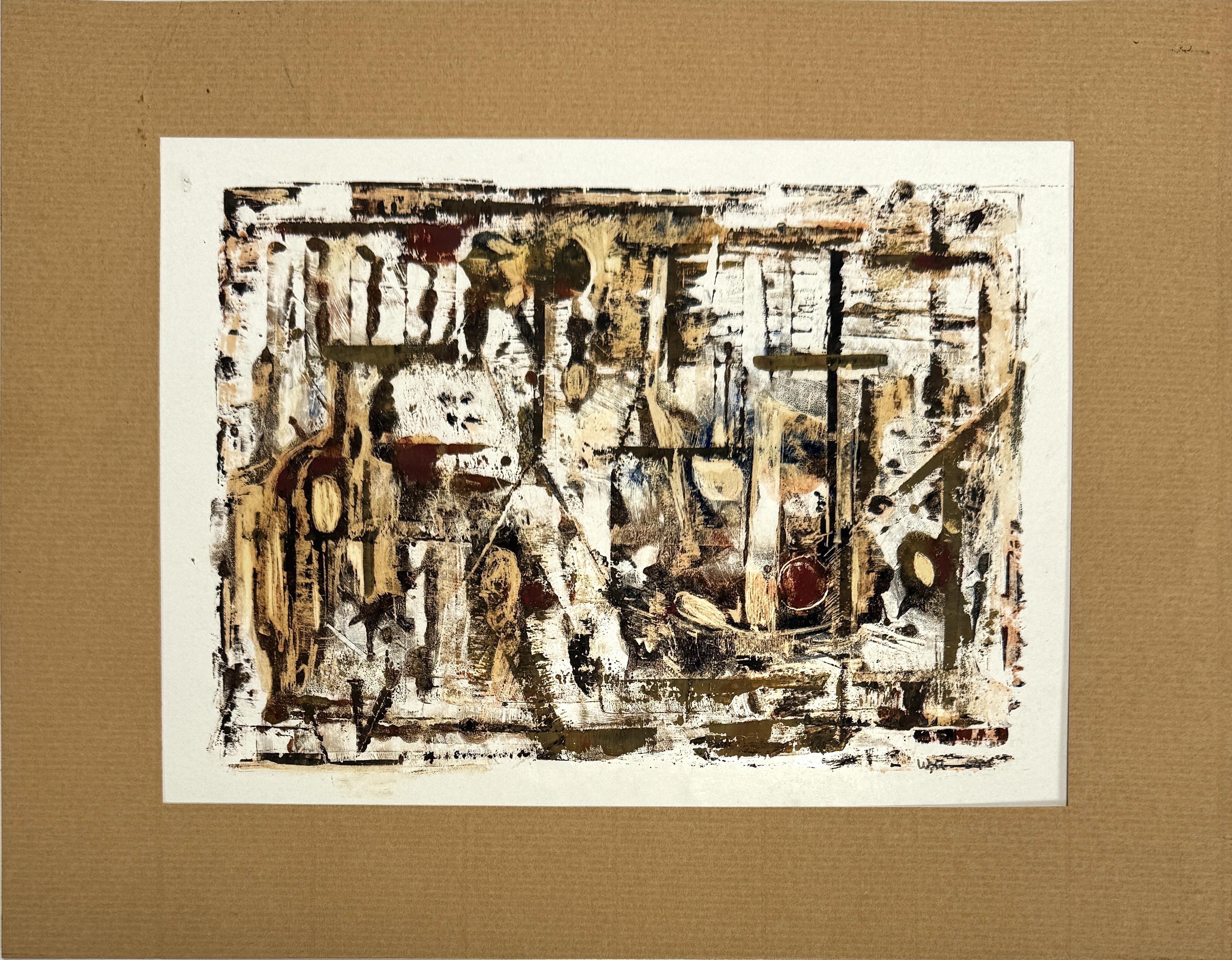 Werk van Wobbe Alkema (1900–1984), datering 1964, uitgevoerd in gemengde techniek op papier in abstract-expressionistische stijl. Gelaagde compositie met transparante en dekkende vlakken, opgebouwd uit bruine, oker en witte tinten, met ritmische lijnen en suggestieve structuren. Rechtsonder met pen of penseel gesigneerd en gedateerd. Geïnteresseerd? Bezoek onze kijkdagen op 29, 30 of 31 augustus van 11:00 tot 17:00 uur! |