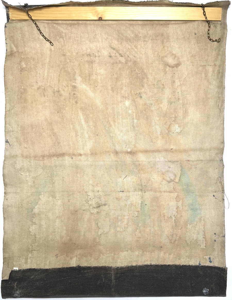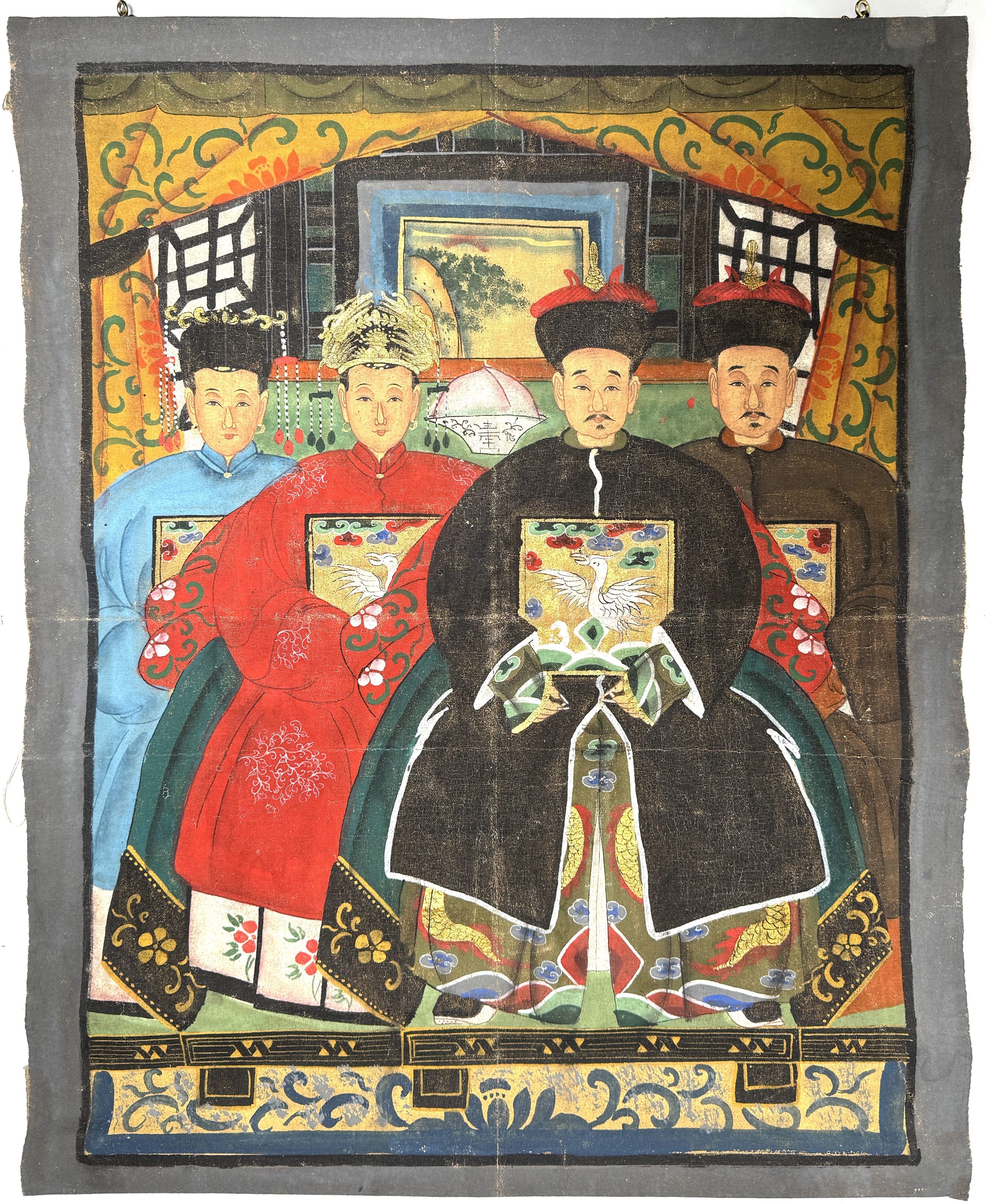 Traditioneel Chinees voorouderportret, eind 19e eeuw, uitgevoerd in mineralen- en plantaardige pigmenten op linnen, met voorstelling van vier figuren in rangkleding, zittend voor decoratieve achtergrond met gordijn en landschap. Achterzijde voorzien van houten ophanglat en metalen ketting. Kenmerkend voor Qing-dynastie portretstijl met symbolische kleding- en kleurdetails. Zeker zijn van deelname? Plaats vanaf 22 augustus een schriftelijk bod online! |