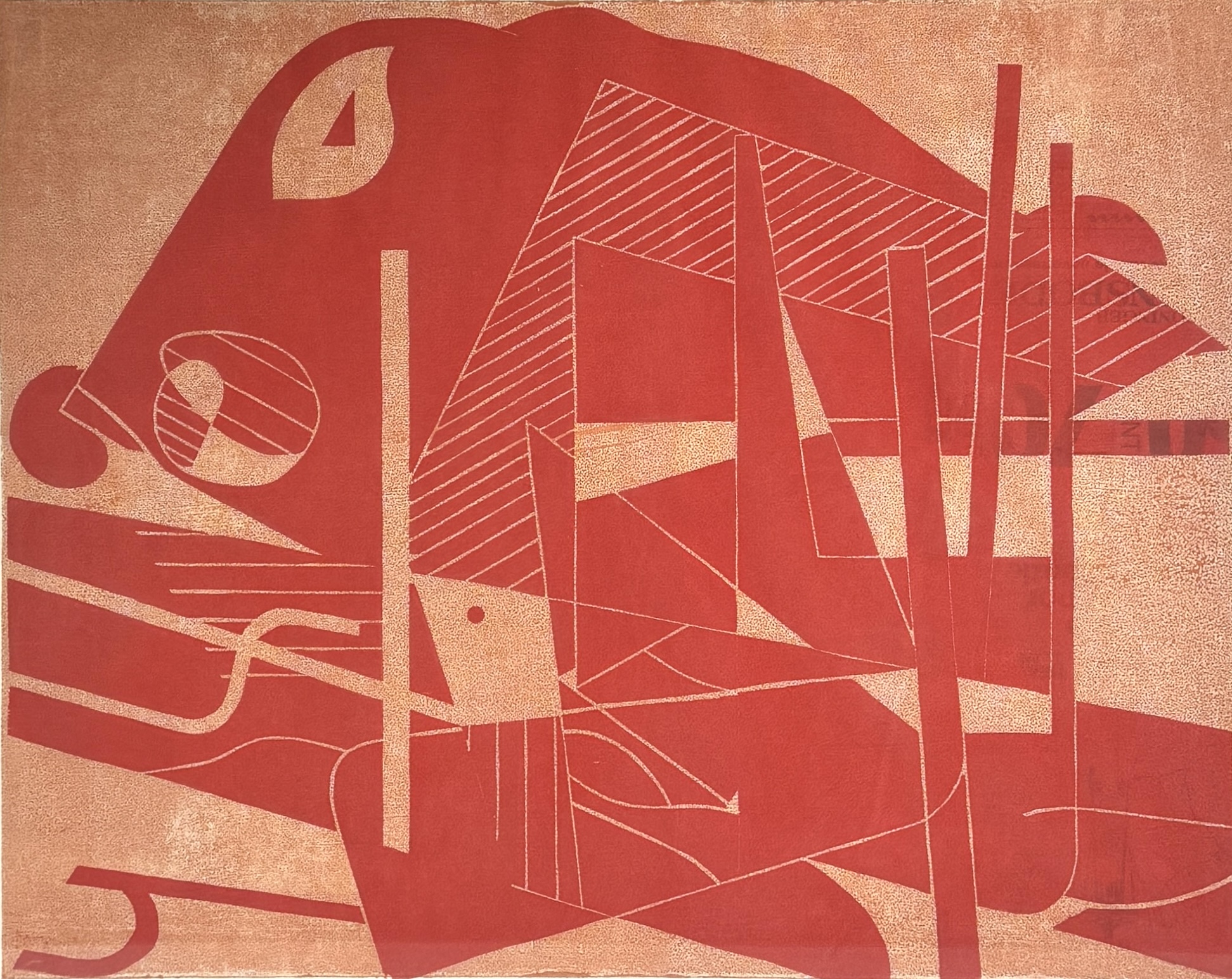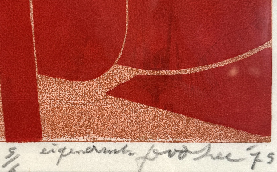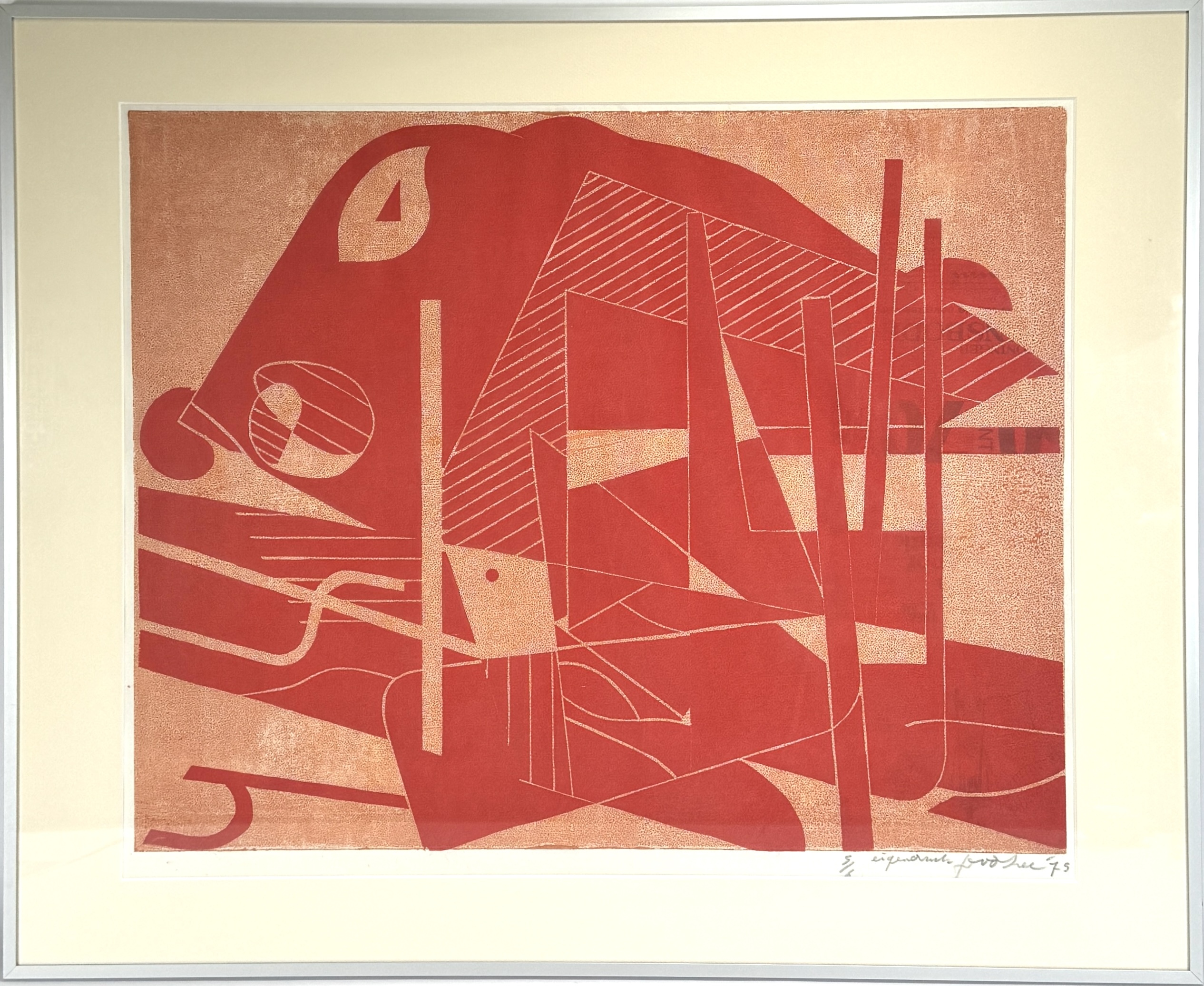 Eigen druk van Jan van der Zee (1898–1988), houtsnede, datering 1975. Papier, eigen druktechniek in rood- en oranje tinten, abstract-geometrische compositie met diagonale en verticale lijnen. Rechtsonder oplagenummer 5/6, met potlood gesigneerd en gedateerd 1975. Kenmerkend ritmisch lijnenspel en strakke vlakverdeling, typerend voor Van der Zees latere abstracte werk. Interesse in de houtsnede? Registreer en bied eenvoudig online mee! |