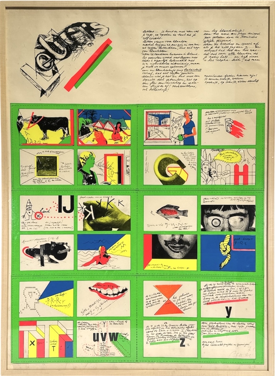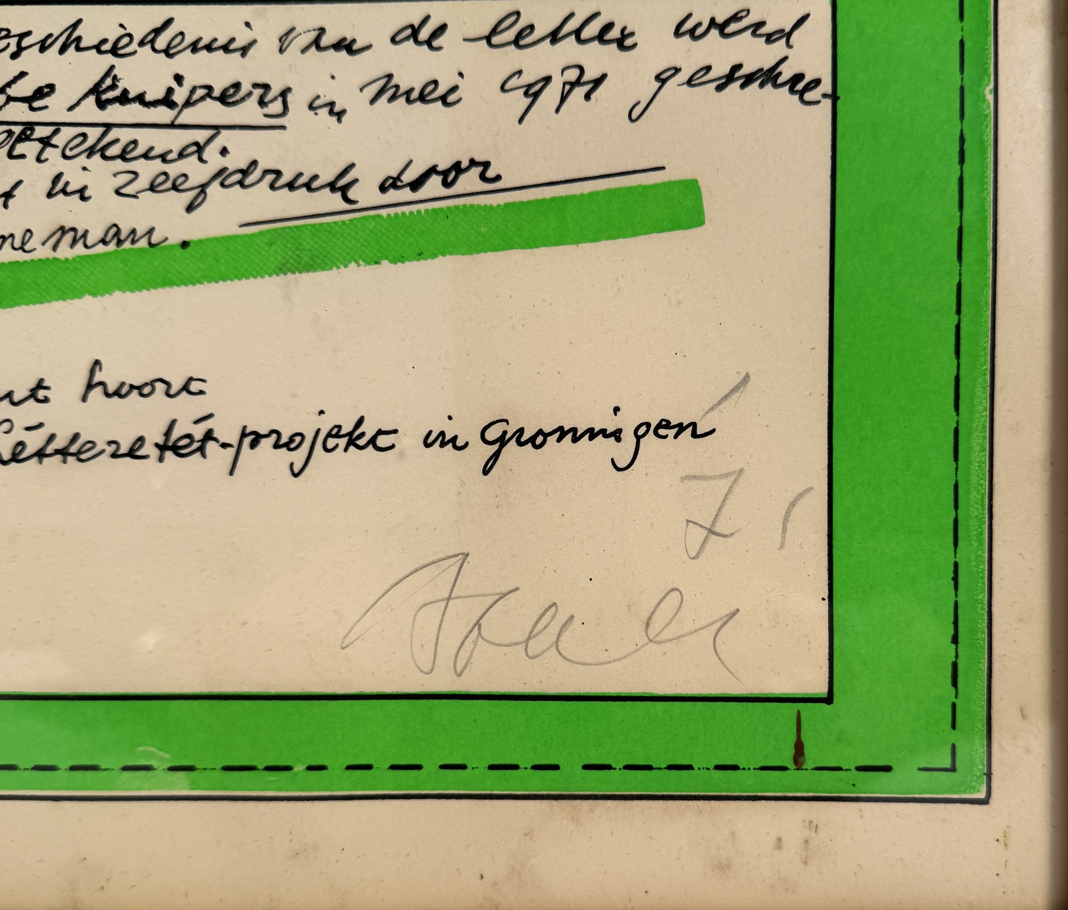 Zeefdruk op papier van Abe Kuipers (1918–2016), gedateerd 1971. Conceptuele en grafische compositie met alfabetische opbouw, kleurrijke vakken en handgeschreven tekst. Het werk bevat een speelse interpretatie van letters, met visuele experimenten in rood, geel, groen en blauw. Rechtsonder gesigneerd, met jaartal '71. Deze zeefdruk verwijst naar typografische vormgeving en benadrukt de relatie tussen beeld en taal. Wilt u de zeefdruk in het echt bekijken? Kom naar de kijkdagen op 29, 30 en 31 augustus! |