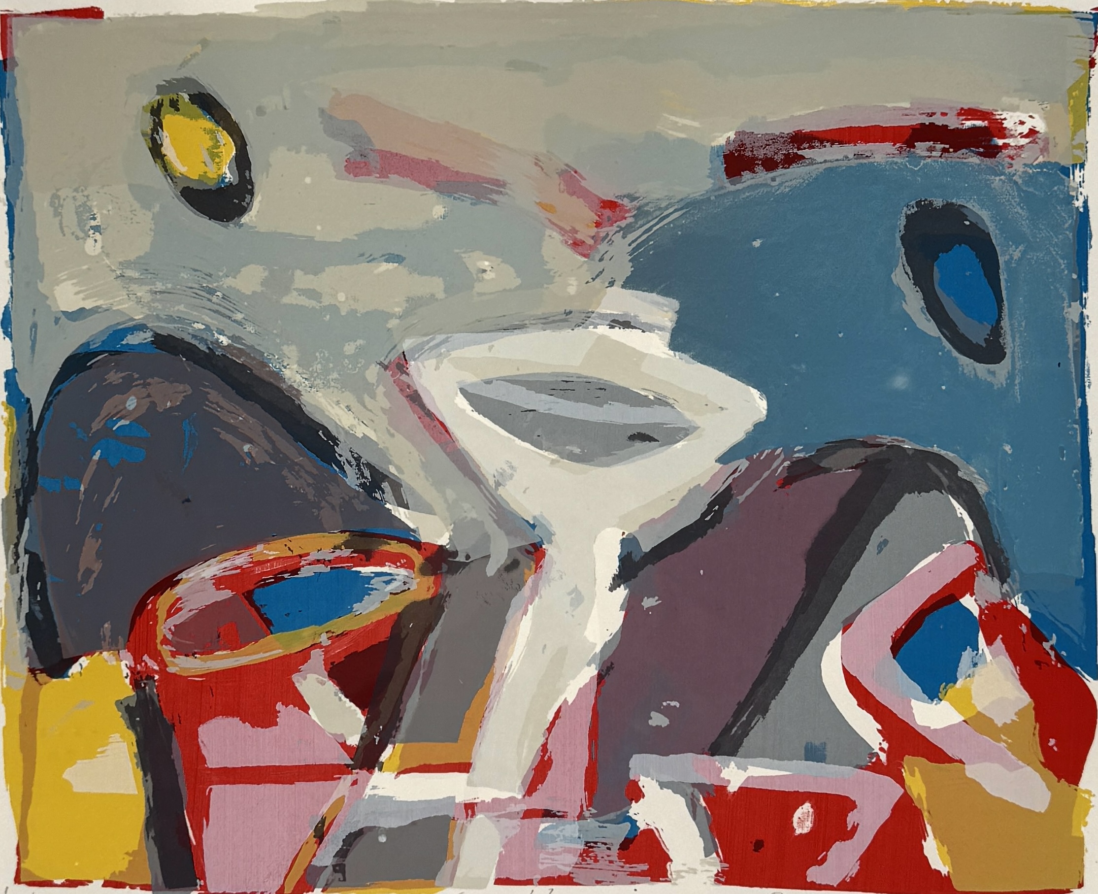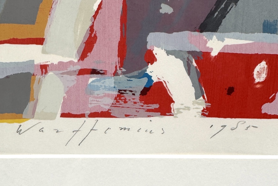Abstract-lyrische zeefdruk van Piet Warffemius (1956), getiteld “De jonge wereld”, 1985. Kleurrijke compositie met dynamische, schilderachtige kleurvlakken in rood, grijs, blauw en geel en zichtbare handbewegingen. Zeefdruk in meerdere lagen op papier; rechtsonder genummerd 37/66, linksonder getiteld en midden onder gesigneerd en gedateerd. Zeker zijn van deelname? Plaats vanaf 22 augustus een schriftelijk bod online! |