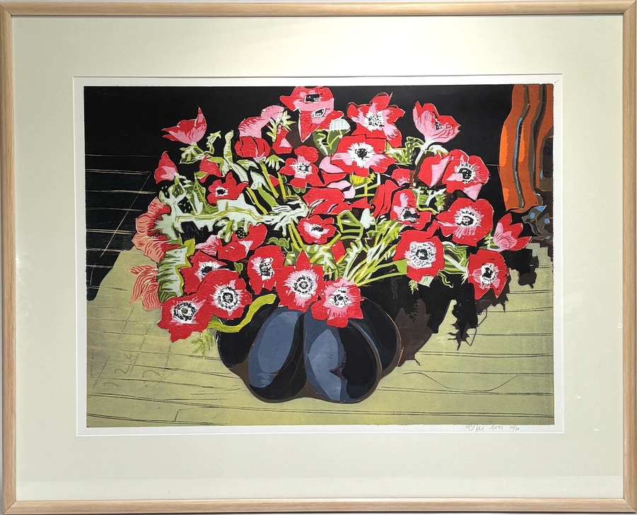 Houtsnede van Vincent van Ojen (1960), papier, handgedrukte meerkleurendruk, gedateerd 2007. Met potlood gesigneerd rechtsonder en oplagenummer 10/30. Expressieve voorstelling van rode anemonen in vaas, gekenmerkt door sterke contourlijnen en contrastrijke kleuren. Ontdek dit werk tijdens onze kijkdagen op 29, 30 en 31 augustus van 11:00 tot 17:00 uur. |