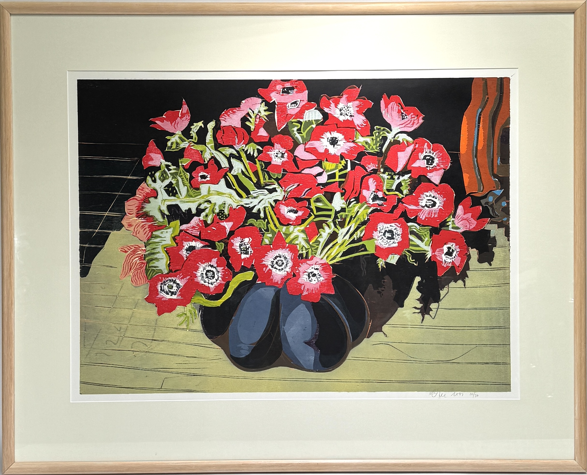 Houtsnede Vincent van Ojen, rode anemonen, 2007