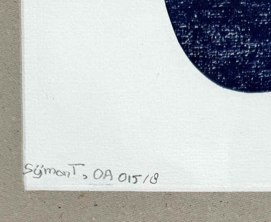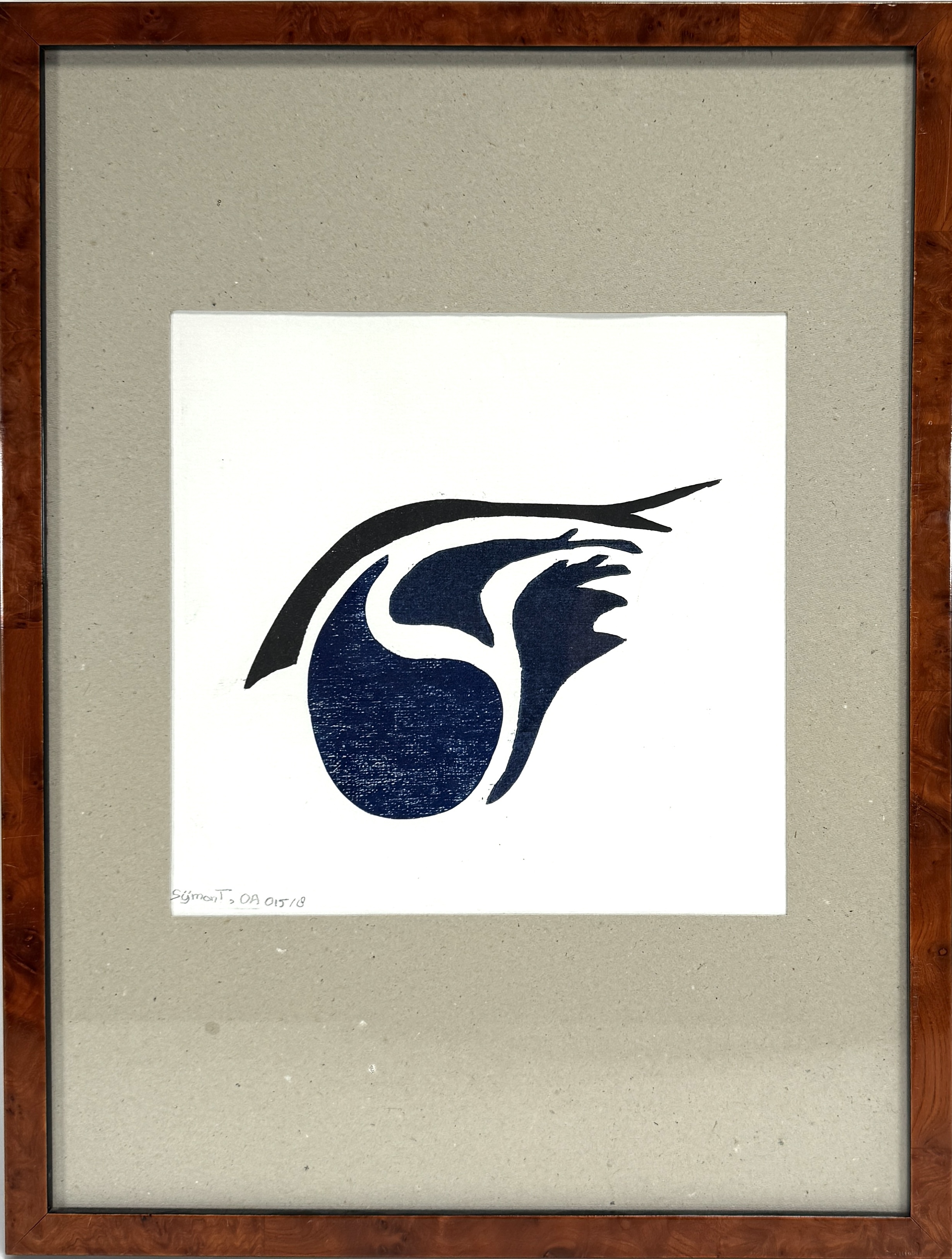 Houtsnede van T. Sijmon, eind 20e eeuw, uitgevoerd op papier en ingelijst met passe-partout in houten lijst. Het werk toont een abstracte, organische vorm in donkerblauw en zwart, linksonder gesigneerd en genummerd 015/18. De subtiele houtnerfstructuur in de inkt versterkt het grafische effect en benadrukt de ambachtelijke techniek van deze beperkte oplage. Wil je de houtsnede in het echt bekijken? Kom naar de kijkdagen op 29, 30 en 31 augustus! |