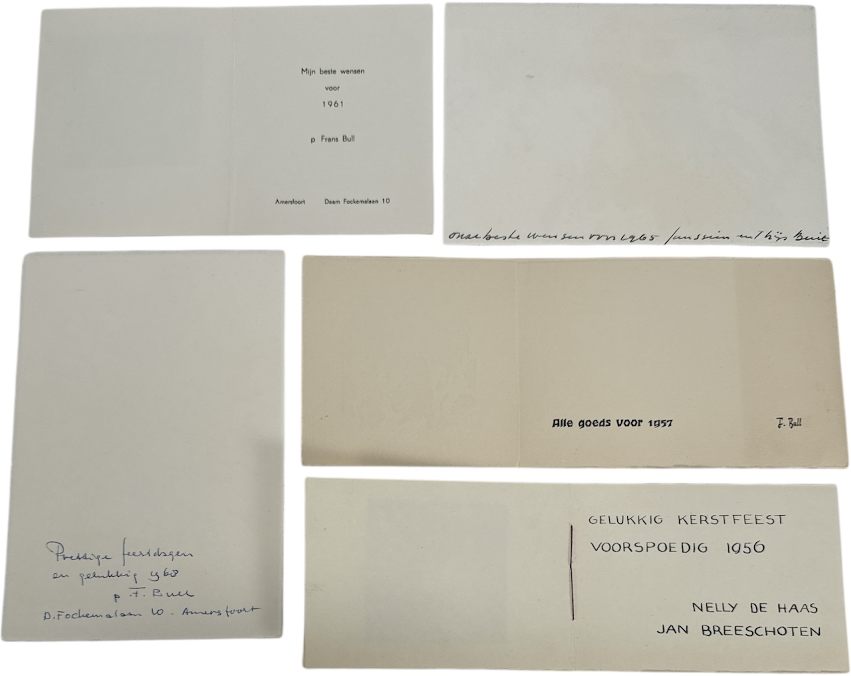 Groep grafische kaarten en houtsneden van Thijs Buit (1933–2019) en Frans Bull, daterend uit de midden 20e eeuw. De set bevat religieus en abstract werk in houtsnede- en hoogdruktechniek op papier. Met nieuwjaarswensen, typografisch en handgeschreven. Eén werk is rechtsonder met potlood gesigneerd Thijs Buit. Opvallende thema’s zijn een engel, abstracte ster en kind.