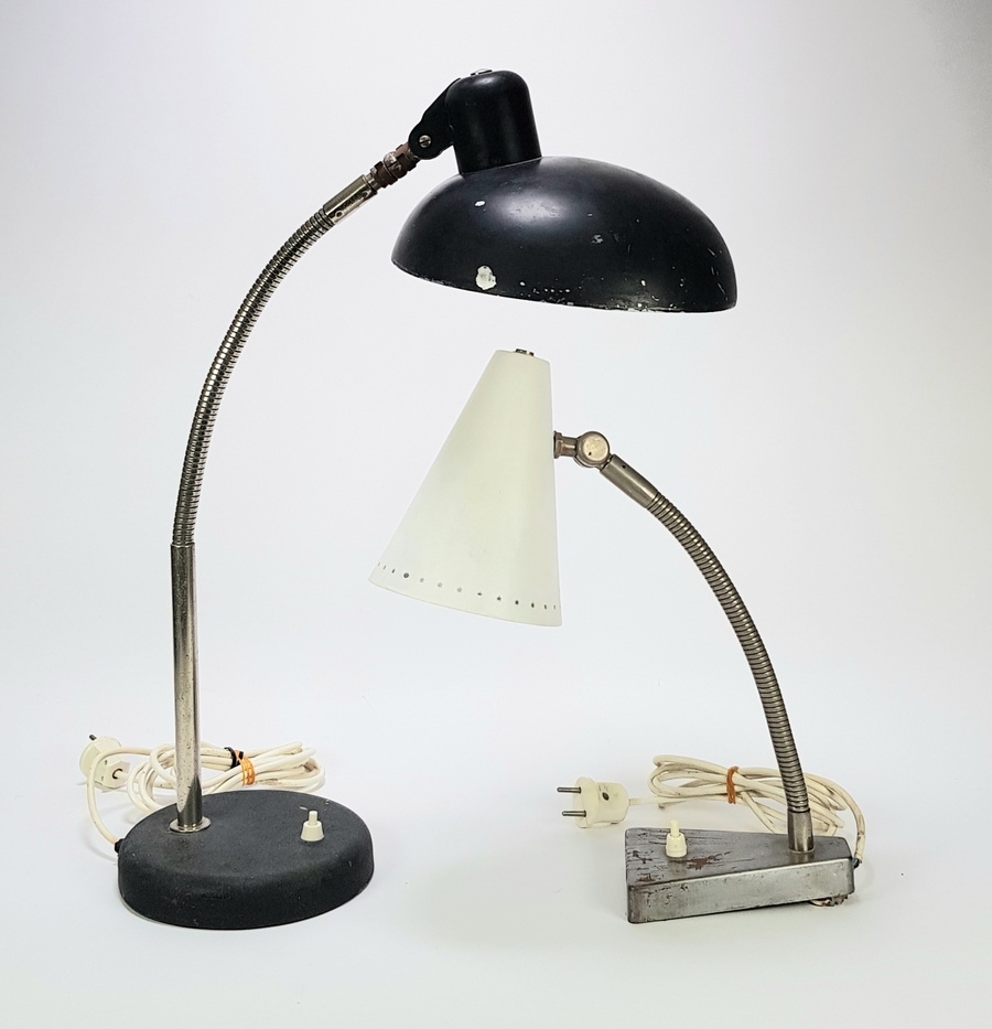 Twee vintage metalen bureaulampen uit de tweede helft 20e eeuw. Eén lamp met zwarte half bolvormige kap en ronde voet, de ander met witte conische kap met perforaties en driehoekige voet. Flexibele metalen armen, functionele industriële stijl. Geverfd metaal en verchroomde onderdelen, typisch voor Europees mid-century design. Kenmerkend door sobere vormen en verstelbare constructie.