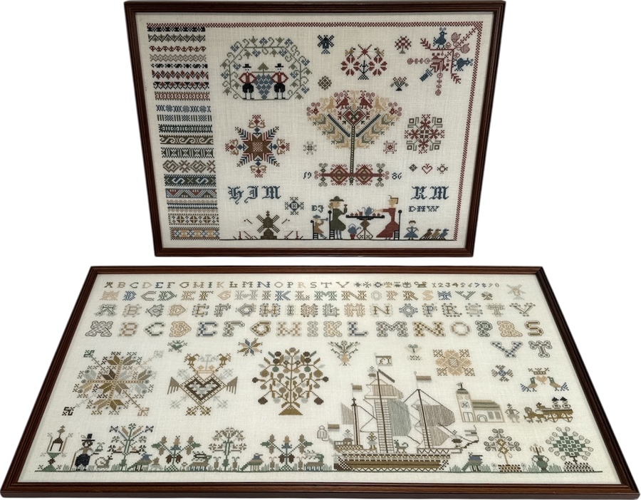 Set van twee merklappen, eind 20e eeuw, uitgevoerd op linnen met katoenen garen in kruissteektechniek. De eerste merklap toont alfabetten, een groot schip, kerk en boommotieven, de tweede merklap toont diverse folkloristische figuren, bomen en geometrische patronen. Beide merklappen zijn decoratief samengesteld, ingelijst in houten lijsten.