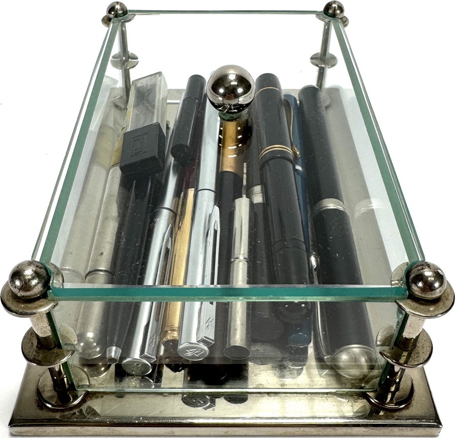 Verzameling vintage vul- en balpennen in een glazen presentatie box, tweede helft 20e eeuw. De box is uitgevoerd in helder glas met verchroomde metalen hoeken en bolvormige knop. De pennen zijn vervaardigd uit metaal en kunststof met diverse clip- en schachtvormen.