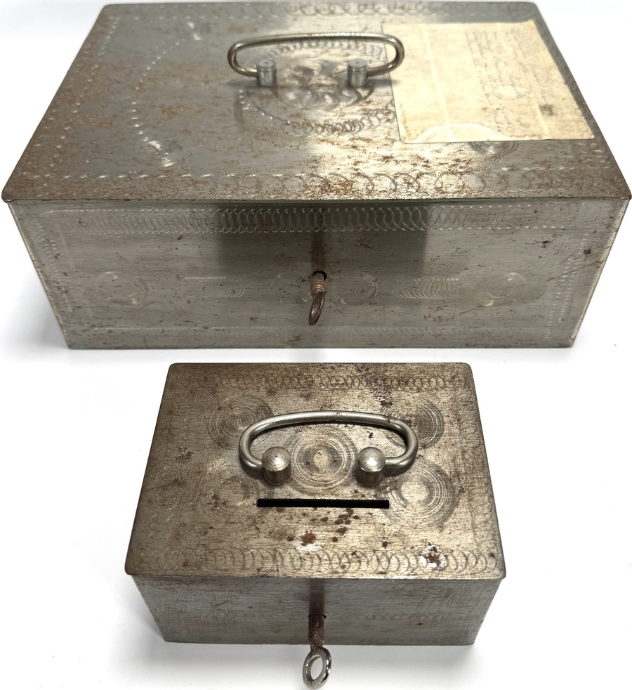 Set van twee metalen geld kistjes (een van Beaumont), midden 20e eeuw, uitgevoerd in gepreegd en vernikkeld staal met decoratieve cirkel- en golfmotieven. Beide kistjes hebben originele handgrepen, sleuven in de deksel en rood gelakte stalen binnenvakken. Eén kistje bevat een handgeschreven notitie van notaris Trenkema over een nalatenschap.