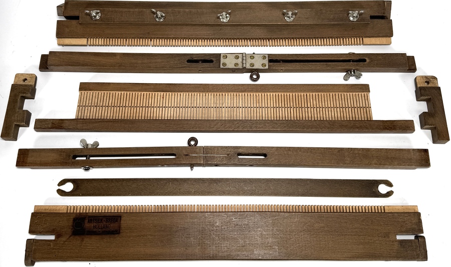 Handweefapparaat uit midden 20e eeuw, vervaardigd door N.V. Artsilk, Breda (Nederland). Gemaakt van hout met metalen verstelonderdelen, voorzien van gestempelde merknaam midden onder. Compleet met originele folders en envelop met grafisch drukwerk over Astrakan-Frotté en Artsilk garen. Functioneel ontwerp voor thuis weven, inclusief kammen, verstelbare latten en vleugelmoeren, bedoeld voor huiselijk textielambacht.