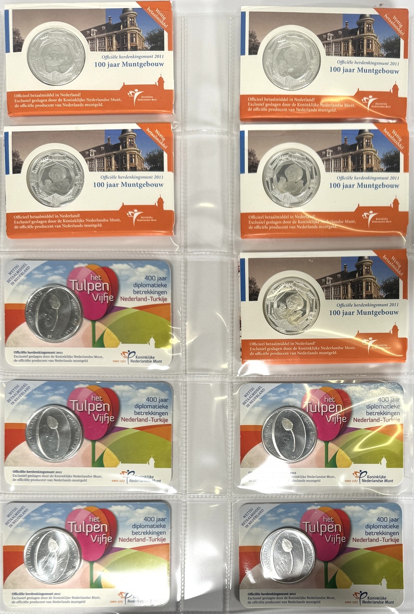 Een collectie van 10 zwaar verzilverde herdenkingsmunten van €5,00 uitgegeven door de Koninklijke Nederlandse Munt in 2011 en 2013. De munten geslagen uit een verzilverde metalen legering, herdenken "100 jaar Muntgebouw" en "Het Tulpen Vijfje".