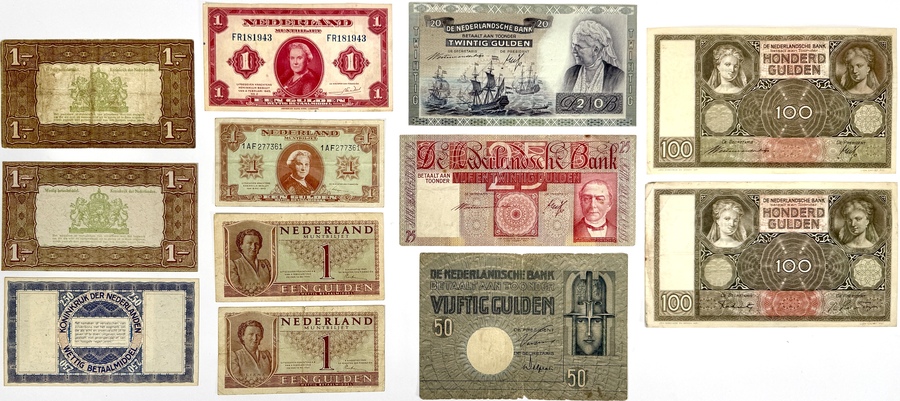 Verzameling van 12 Nederlandse bankbiljetten en zilverbonnen, uitgegeven circa 1920 tot circa 1955, vervaardigd door De Nederlandsche Bank. Gedrukt op speciaal bankbiljetpapier met diepdruk en offset, in functioneel en rijk gedetailleerd ontwerp. Inclusief exemplaren met portretten van Wilhelmina en Juliana, decoratieve geometrische motieven en diverse coupures van 1 tot 100 gulden. 12 bankbiljetten: 1 gulden (6x), 2,5 gulden, 20 gulden, 25 gulden, 50 gulden en 100 gulden (2x).