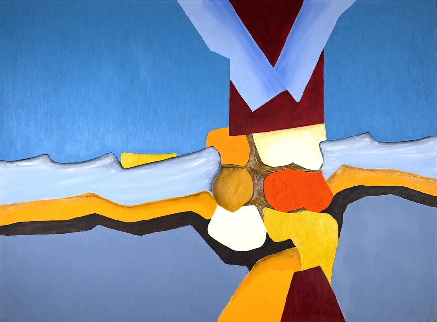 Schilderij van André Spruit (geboren 1941), olieverf op paneel. Abstracte, geometrisch opgebouwde compositie met opvallende kleurvlakken in blauw, geel, oranje, wit en rood. Sterke lijnen en ritmische vlakverdeling bepalen het beeld. Het werk combineert constructivistische en abstracte invloeden met een moderne uitstraling en is omlijst met een lichte houten rand. Rechtsonder gesigneerd, 1981.