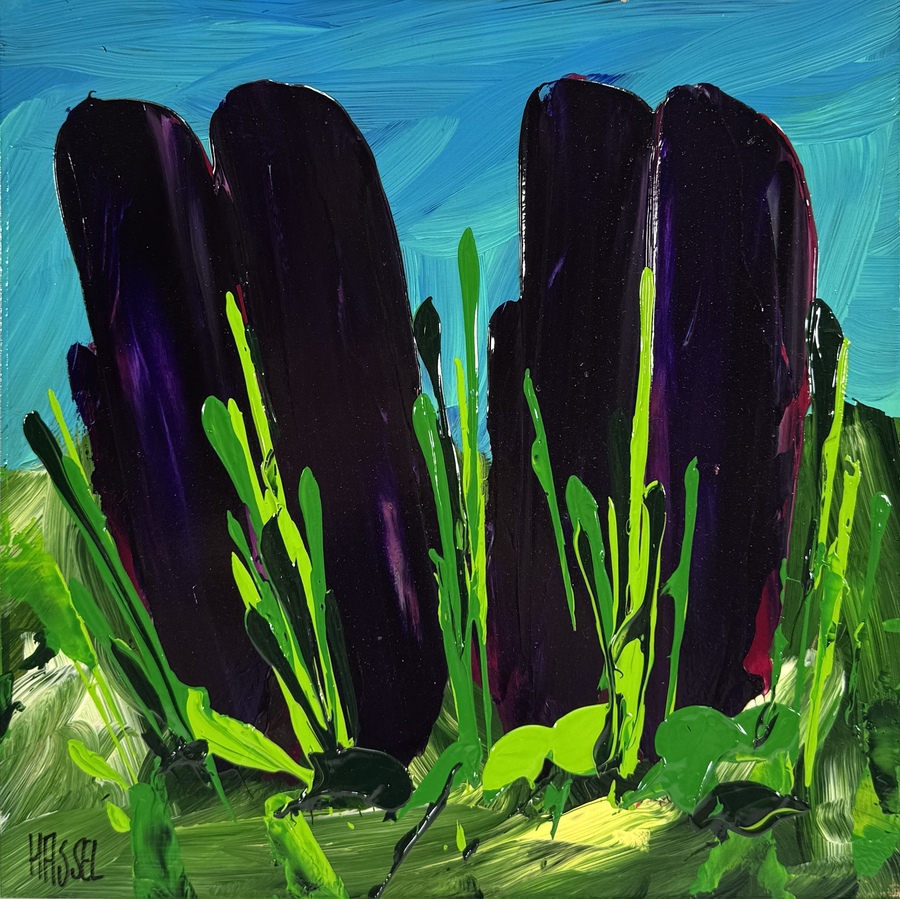 Acrylverfschilderij van Ad van Hassel (1953), eind 20e eeuw, op paneel. Expressionistische stijl met krachtige paarse en felgroene vormen, mogelijk bloemmotieven, tegen een contrasterende blauwe achtergrond. Pasteuze verfopbouw en brede kwaststreken typeren dit werk. Linksonder gesigneerd "Hassel". Achterzijde voorzien van kunstenaarsinformatie en atelierdocumentatie.