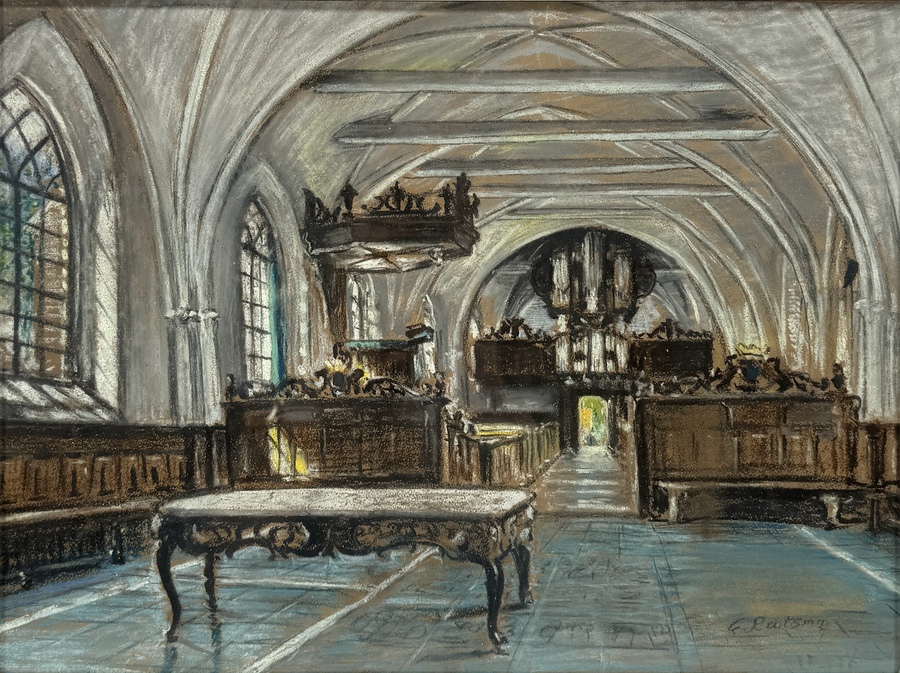 Pasteltekening van Egbert Reitsma (1892–1976), interieur Johannes de Doperkerk Zandeweer, midden 20e eeuw. Architectonisch gedetailleerde weergave met aandacht voor gotische gewelven, houtwerk en perspectivische diepte. Papier, pasteltechniek, rechtsonder gesigneerd E. Reitsma. Het werk reflecteert Reitsma’s achtergrond als kerkarchitect en zijn documenterende aanpak van historische interieurs.