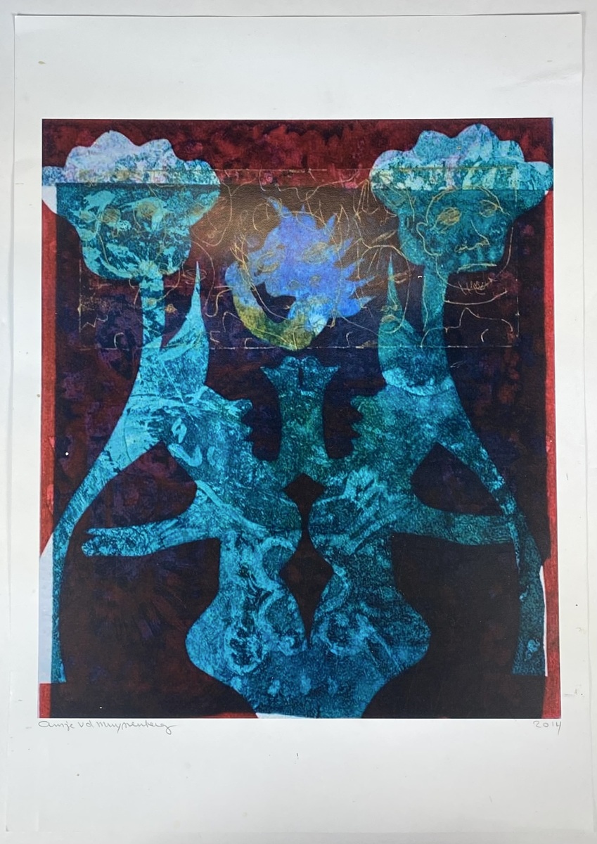 Een print van Anja van de Muynenberg uit 2014, uitgevoerd in een gemengde techniek van zeefdruk en monotype op papier. De stijl is abstract modern met een centraal, symmetrisch beeld in diepblauw en groen op een rode achtergrond. Het werk is links onder met potlood gesigneerd en rechtsonder gedateerd door de maker.