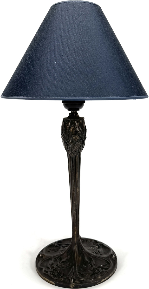 Art Nouveau stijl lamp, ongesigneerd, tweede helft 20e eeuw. Gegoten metalen voet met gestileerde bladranken in hoog reliëf en donker gepatineerd oppervlak. Slanke stengelvormige schacht die overgaat in brede voet met florale motieven. Moderne kap in zwart textiel met goudkleurige binnenzijde. Elektrische fitting gemoderniseerd.