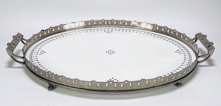 Art Deco ovalen dienblad, eerste kwart 20e eeuw, uitgevoerd in verchroomd metaal en porselein met opengewerkt metalen frame en pijlvormige perforaties, grepen met geometrische motieven. Het inzetblad is versierd met grijsgroen geometrisch lijnenspel en ruitvormige accenten. Voorzien van vier bolvormige pootjes.