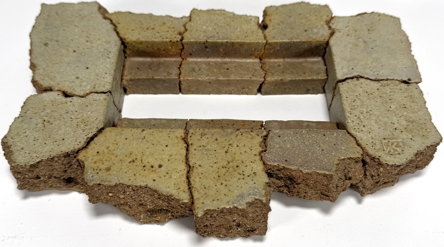 Sculpturaal keramisch object van Michel Kuipers (geboren 1949), vervaardigd uit steengoed met deels gespikkelde glazuurlaag. Het werk bestaat uit acht fragmenten met ruwe, gebroken randen en een open, rechthoekig midden. De combinatie van robuuste textuur en glad glazuur benadrukt materiaalonderzoek en structuur.