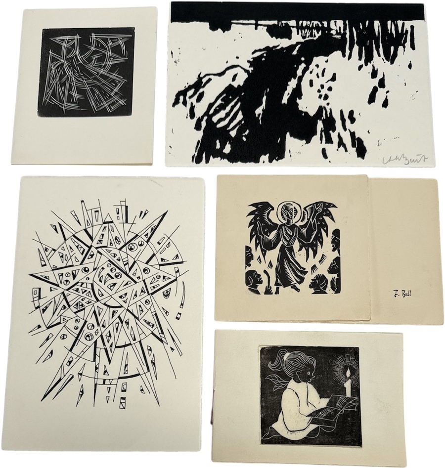 Groep grafische kaarten en houtsneden van Thijs Buit (1933–2019) en Frans Bull, daterend uit de midden 20e eeuw. De set bevat religieus en abstract werk in houtsnede- en hoogdruktechniek op papier. Met nieuwjaarswensen, typografisch en handgeschreven. Eén werk is rechtsonder met potlood gesigneerd Thijs Buit. Opvallende thema’s zijn een engel, abstracte ster en kind.