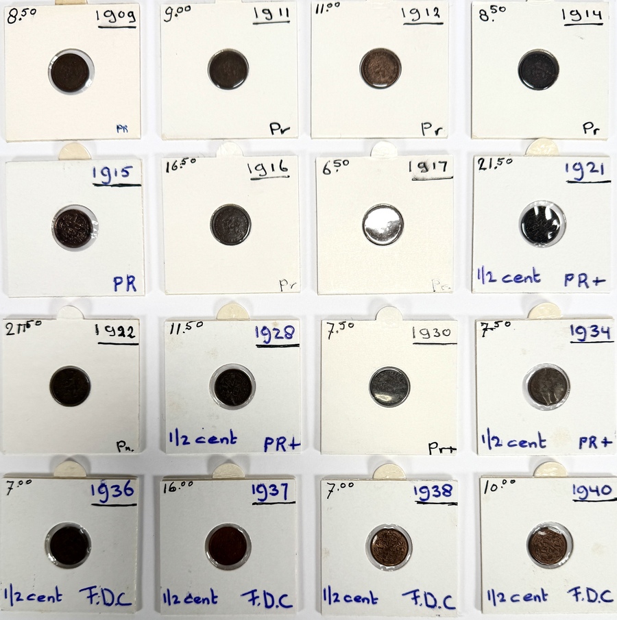 Verzameling van zestien Nederlandse ½ cent munten. Deze geslagen munten zijn gemaakt van brons en messing en dateren van 1909 tot 1940. De collectie toont diverse jaargangen met het Nederlandse wapen en de nominale waarde '1/2 CENT' op een krans van takken.