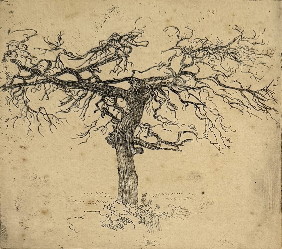 Ets van Reinhart Dozy (1880–1947), ca. 1907, oplage circa 6 stuks. Gedetailleerde voorstelling van een kale eikenboom, uitgevoerd op papier. Rechtsonder in potlood gesigneerd “DOZY”. Achterzijde met handgeschreven notitie met titel, datering en oplage.