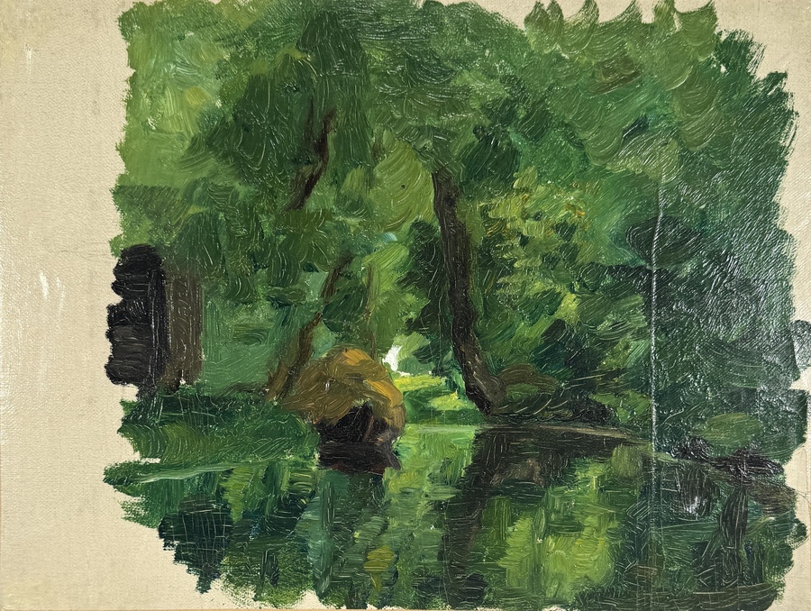 Schilderij in impressionistische stijl, ongesigneerd, omstreeks eind 20e eeuw. Voorstelling van een bosrijke omgeving met weerspiegeling in stilstaand water, geschilderd met losse, korte penseelstreken in diverse groentinten. Olieverf op doek, deels onbeschilderde randen. Achterzijde met tentoonstellingsetiket Museum Vledder (2001–2002).