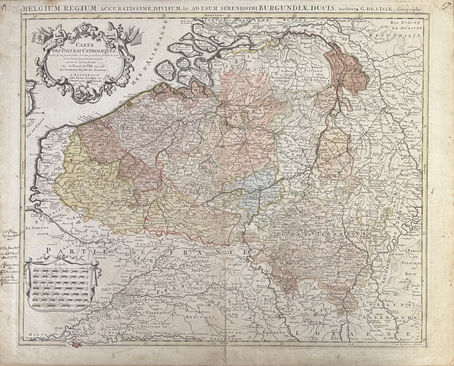 Kopergravure met handkleuring van Guillaume de l’Isle (1675–1726), ca. 1710, getiteld Carte des Pays Bas Catholiques. Uitgevoerd op handgeschept papier met siercartouche, schaalverdeling in regionale lengtematen, en handgeschreven annotaties. De kaart toont de Zuidelijke Nederlanden met politieke indeling in kleur. Rechtsonder gesigneerd in de plaat met naam van de maker.