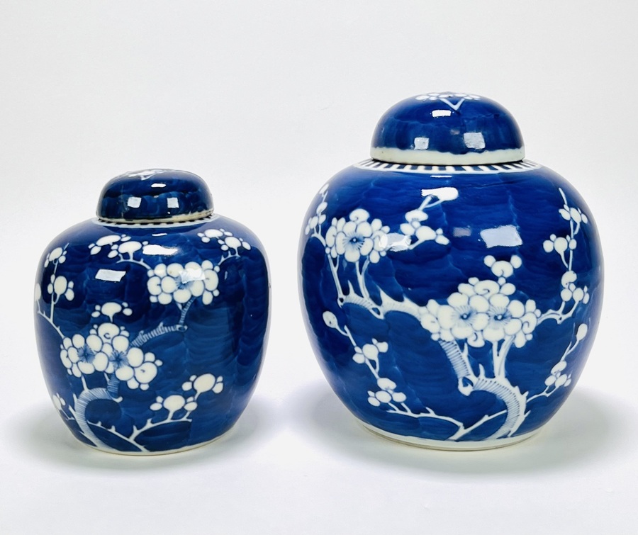 Twee Chinese porseleinen gemberpotten, eind 19e eeuw, met pruimenbloesemdecor op blauw fond. Handbeschilderd in blauw met het karakteristieke “gebroken ijs” motief. Eén pot met originele kurkenstop. Dubbele blauwe cirkel op de onderzijde van beide potten.