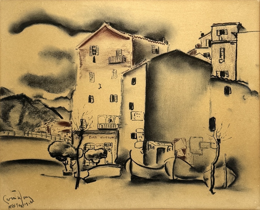 Pasteltekening van Germ de Jong (1886–1967), uitgevoerd in pastel en houtskool op papier. Voorstelling van een straatbeeld in Menton, Zuid-Frankrijk, met markante architecturale elementen en sfeerbepalende wolkenpartij. Linksonder gesigneerd en gedateerd Germ de Jong / Menton 1946. Op de achterzijde geadresseerd etiket met zijn Parijse atelieradres. Frans interbellum met expressionistische en modernistische invloeden.