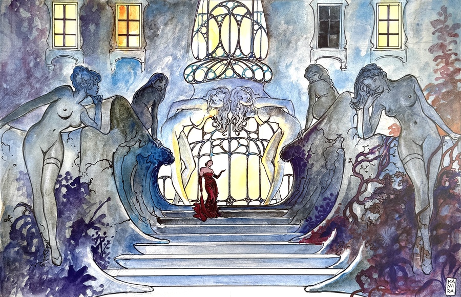 Zeefdruk van Milo Manara (geboren 1945), uitgevoerd op papier, in sensuele, fantasierijke stijl. Afgebeeld een vrouw in rode japon op trappen, geflankeerd door monumentale vrouwelijke naakten geïntegreerd in golven en architecturale vormen. Rechtsonder gesigneerd "Manara" in zwarte inkt, zonder zichtbare datering, met kenmerkende surrealistische en erotische beeldtaal.