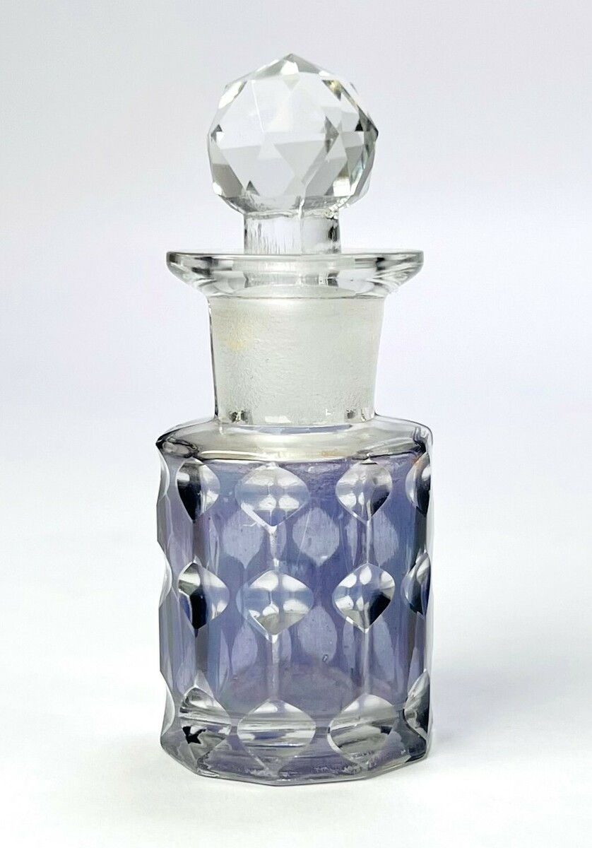 Parfumflesje van kleurloos en paars getint geslepen kristalglas, eind 19e/begin 20e eeuw. Achthoekige vorm met diep geslepen geometrisch patroon en bijpassende facetgeslepen stop. Typisch Midden-Europees gebruiksglas met kenmerkende technische precisie en afwerking, vervaardigd via slijpen en polijsten.