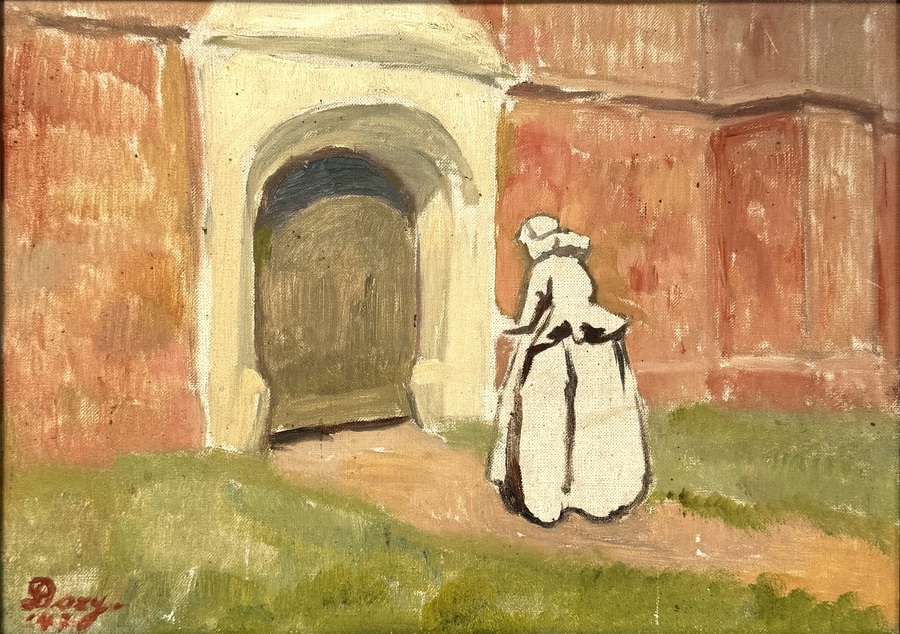 Schilderij van Reinhart Dozy (1880–1947), uitgevoerd in olieverf op doek. Voorstelling van een vrouw in witte klederdracht voor een grote poort in een roodbruine gevel, in figuratieve stijl met impressionistische toets. Linksonder gesigneerd en gedateerd Dozy 47.
