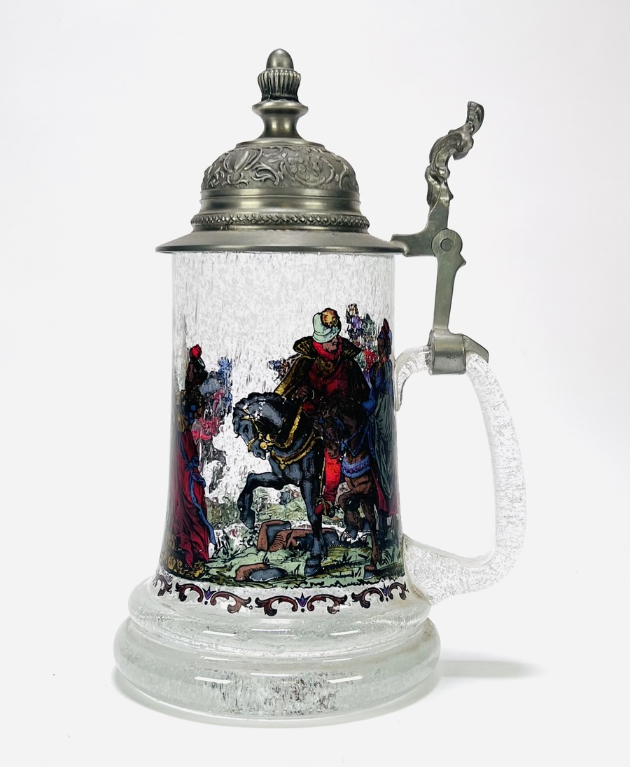 Bierpul uit midden 20e eeuw, vervaardigd uit helder glas met luchtinsluitingen en voorzien van een tinnen deksel met florale ornamentiek. De wand toont een doorlopende, polychrome voorstelling met figuren in renaissancekostuums, waaronder ruiters en hofdames. De duimrust is uitgevoerd in de vorm van een dierenkop.