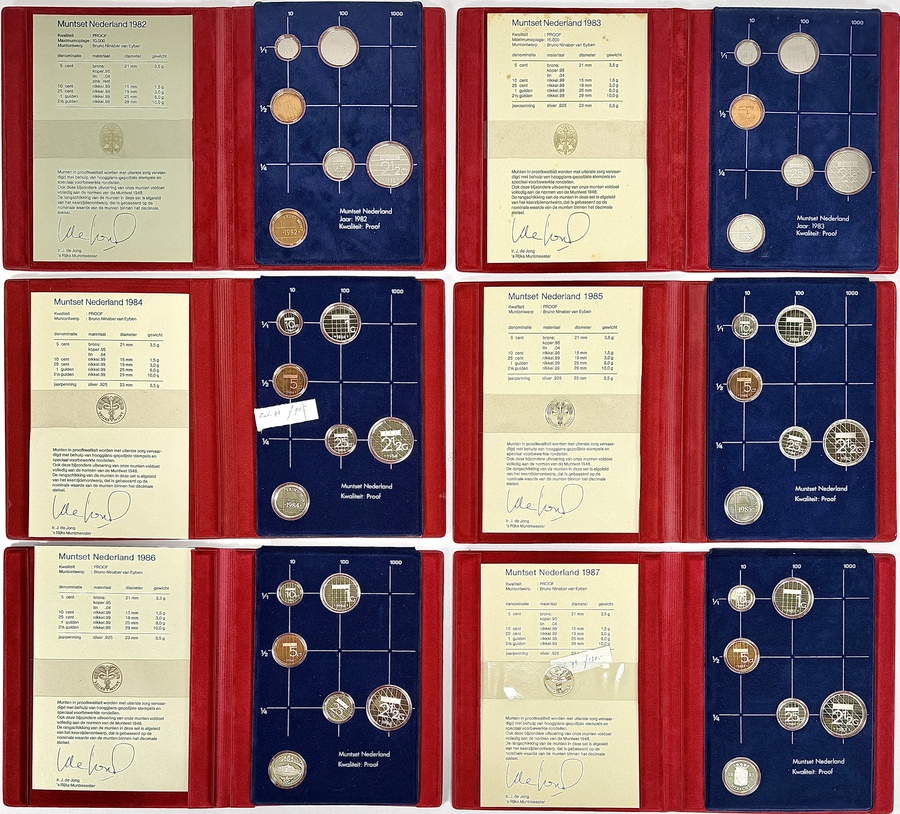 Twaalf Nederlandse proof muntsets, 1982–1993, ontworpen door Bruno Ninaber van Eyben (1950) en geslagen door de Nederlandse Munt te Utrecht. Basismetalen samenstelling: nikkel, cupronikkel en messing. Elke map bevat de circulatiemunten 5 cent t/m 2½ gulden in proofkwaliteit, plus een jaarpenning “Utrecht”, gepresenteerd in originele blauwe cassettes met certificaatkaart. Modern geometrisch Beatrix-ontwerp met rasterportretten en duidelijke jaartallen per set.
