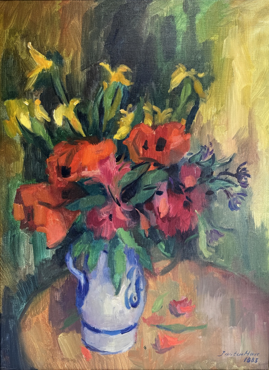 Schilderij van Jan ten Have (1903–1991), uitgevoerd in olieverf op doek, met een bloemstilleven in expressieve stijl. Afgebeeld zijn felgekleurde bloemen in een witte kan met blauwe versiering op een tafel. Vrij geschilderde achtergrond in groene en gele tinten. Rechtsonder gesigneerd en gedateerd in blauwe verf Jan ten Have 1983.