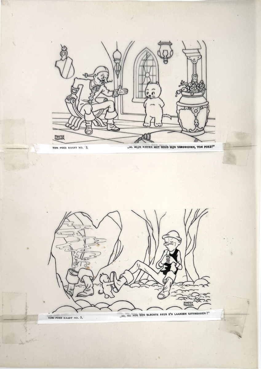 Twee originele tekenfilmcellen of transparanten met illustraties van Marten Toonder (1912–2005), getiteld "Tom Poes Kaart no. 3" en "Kaart no. 5", uitgevoerd in zwarte inkt op transparant kunststof. Voorzien van getypte ondertitels en gemonteerd op karton. Stripstijl met karikaturale figuren, waaronder Tom Poes en een reusachtig personage.