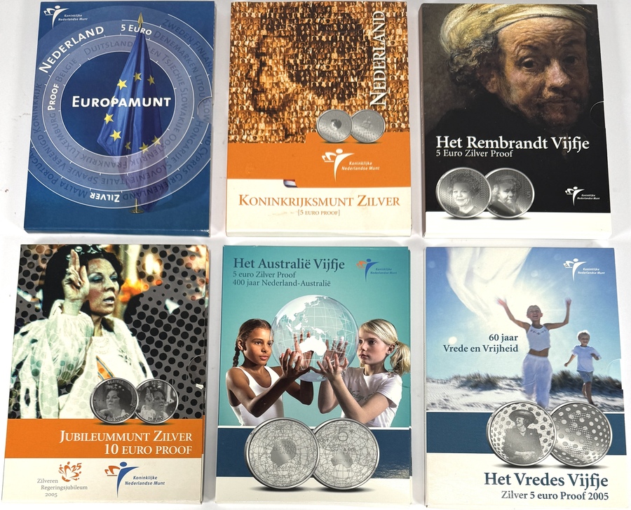 Een verzameling van zes herdenkingsmunten in originele verpakking, uitgegeven door de Koninklijke Nederlandse Munt. De munten zijn van zilver en verzilverde metalen en dateren uit 2005 en 2006. De collectie omvat de "Europamunt", "Het Vredes Vijfje", "Het Rembrandt Vijfje", "Het Australië Vijfje", de "Zilveren Jubileummunt" en de "Zilveren Koninkrijksmunt".